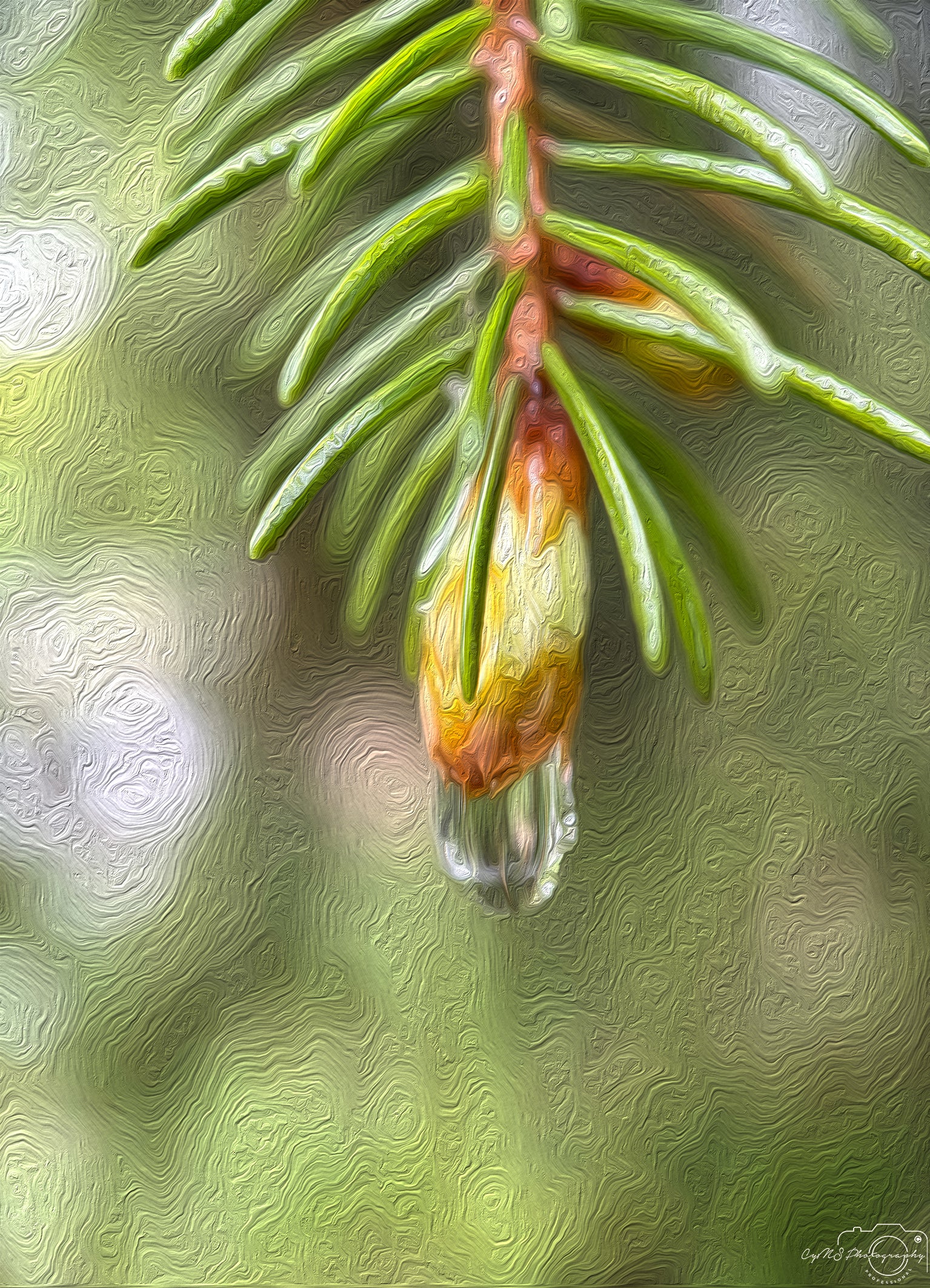 Sur un Picea abies se trouve une magnifique goutte d'eau, posée gracieusement sur l'une de ses branches denses et pointues. Le vert profond de l'épicéa contraste magnifiquement avec la clarté de la goutte, qui capte la lumière dans un bref instant chatoyant, capturant l'essence du calme et l'élégance tranquille de la nature.