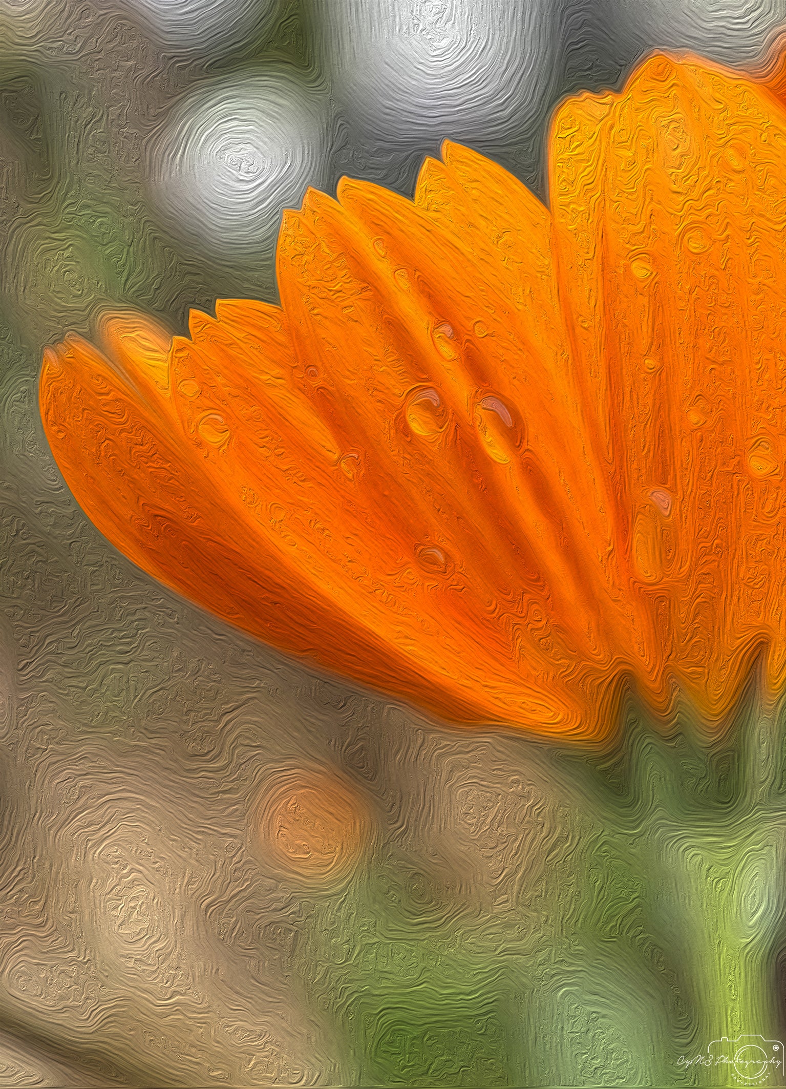 La pluie tombe sur un Calendula officinalis , et l'orange vif de ses pétales est à couper le souffle. De nombreuses gouttes d'eau sont éparpillées à sa surface, scintillantes comme de minuscules bijoux. Le contraste entre les pétales éclatants et les gouttelettes chatoyantes crée un spectacle saisissant, capturant la beauté de l'instant après la pluie.