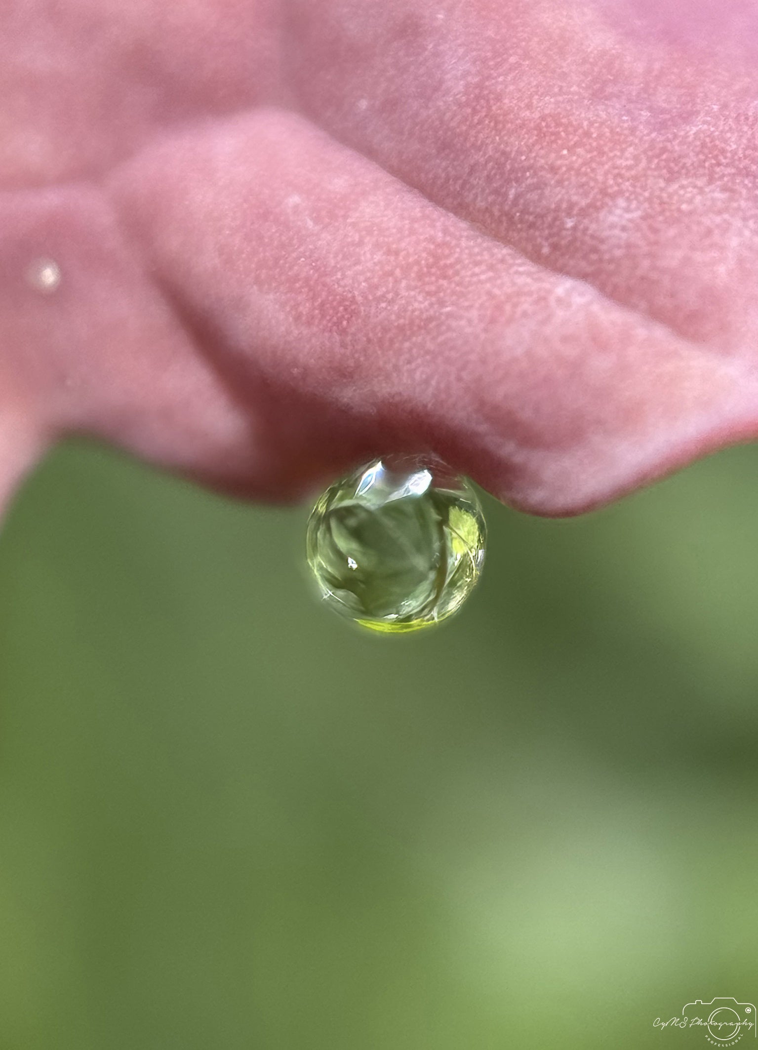 Sur une feuille presque morte d' Atriplex hortensis , au rose vif déclinant, repose une magnifique goutte d'eau. La goutte reflète le vert vif environnant, créant un contraste saisissant avec la couleur fanée de la feuille. Elle capture la beauté éphémère de la nature, où, même en déclin, subsiste un instant de vie.