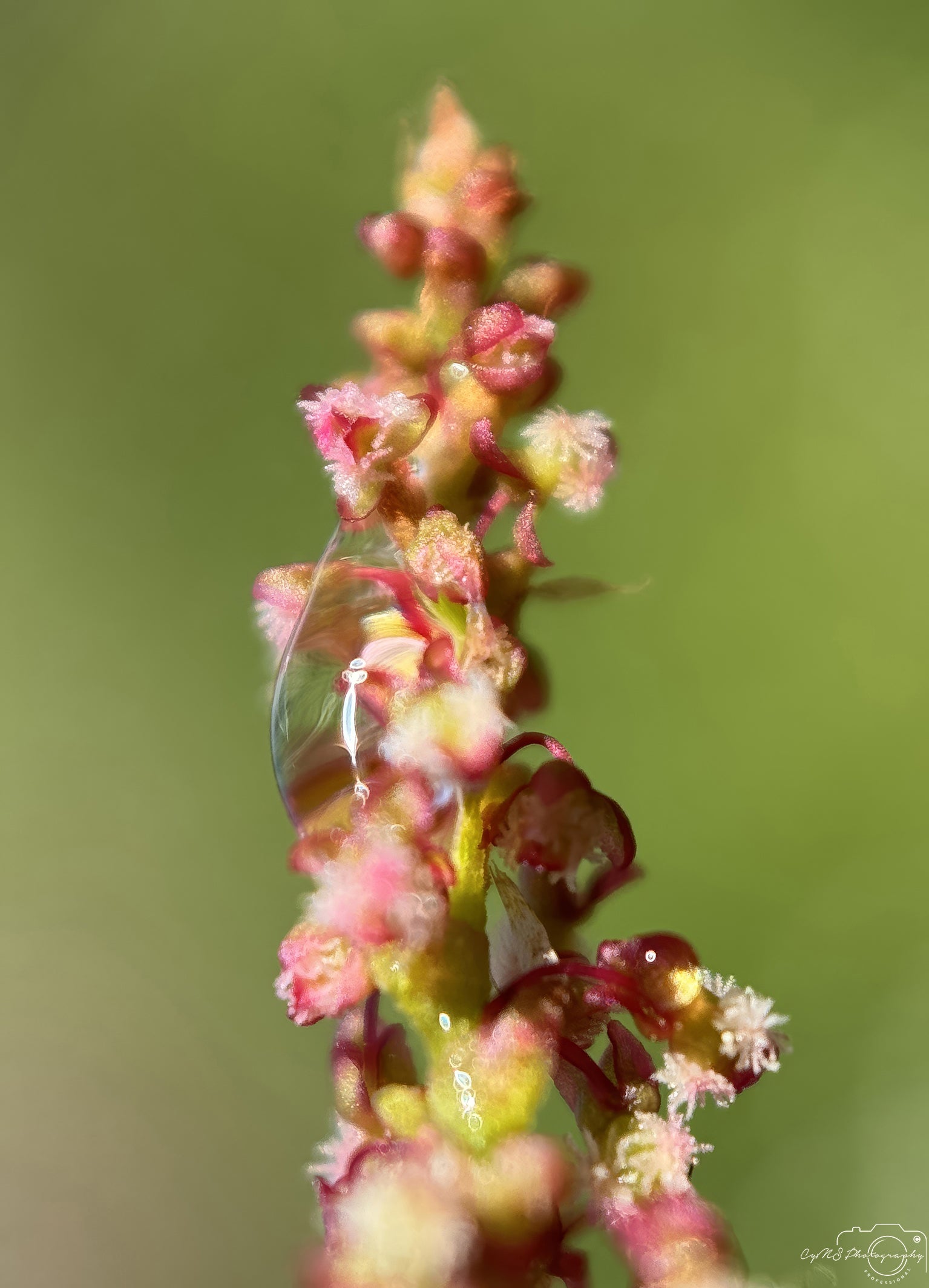 Sur le côté de l'extrémité de la fleur de Rumex acetosa se trouve une grosse goutte d'eau qui capture certains de ses pétales, aux couleurs vives jaune et rouge. La goutte reflète les teintes vibrantes, rehaussant la magnificence de la fleur. Le contraste saisissant entre les couleurs et la transparence de la goutte crée un moment à couper le souffle. Cette scène magnifique met en valeur la fleur dans tous ses détails.