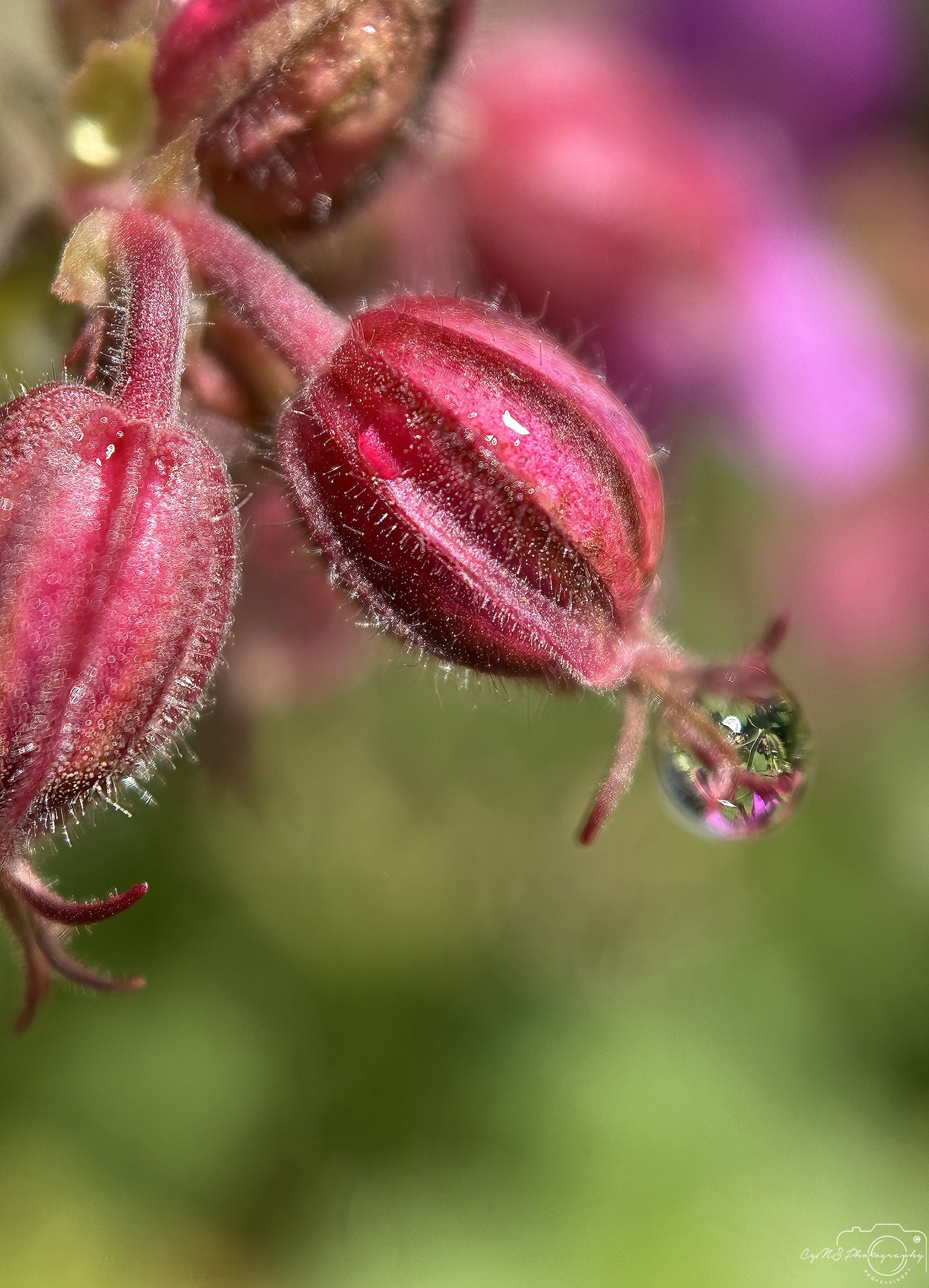 Une goutte de rosée se pose délicatement sur l'extrémité de la fleur de Géranium macrorrhizum , scintillant à la lumière comme si un joaillier avait placé une pierre précieuse impeccable sur son pétale. La minuscule goutte capture et réfracte son environnement, transformant l'élément le plus simple de la nature en un ornement radieux, couronnant la fleur d'une élégance discrète.