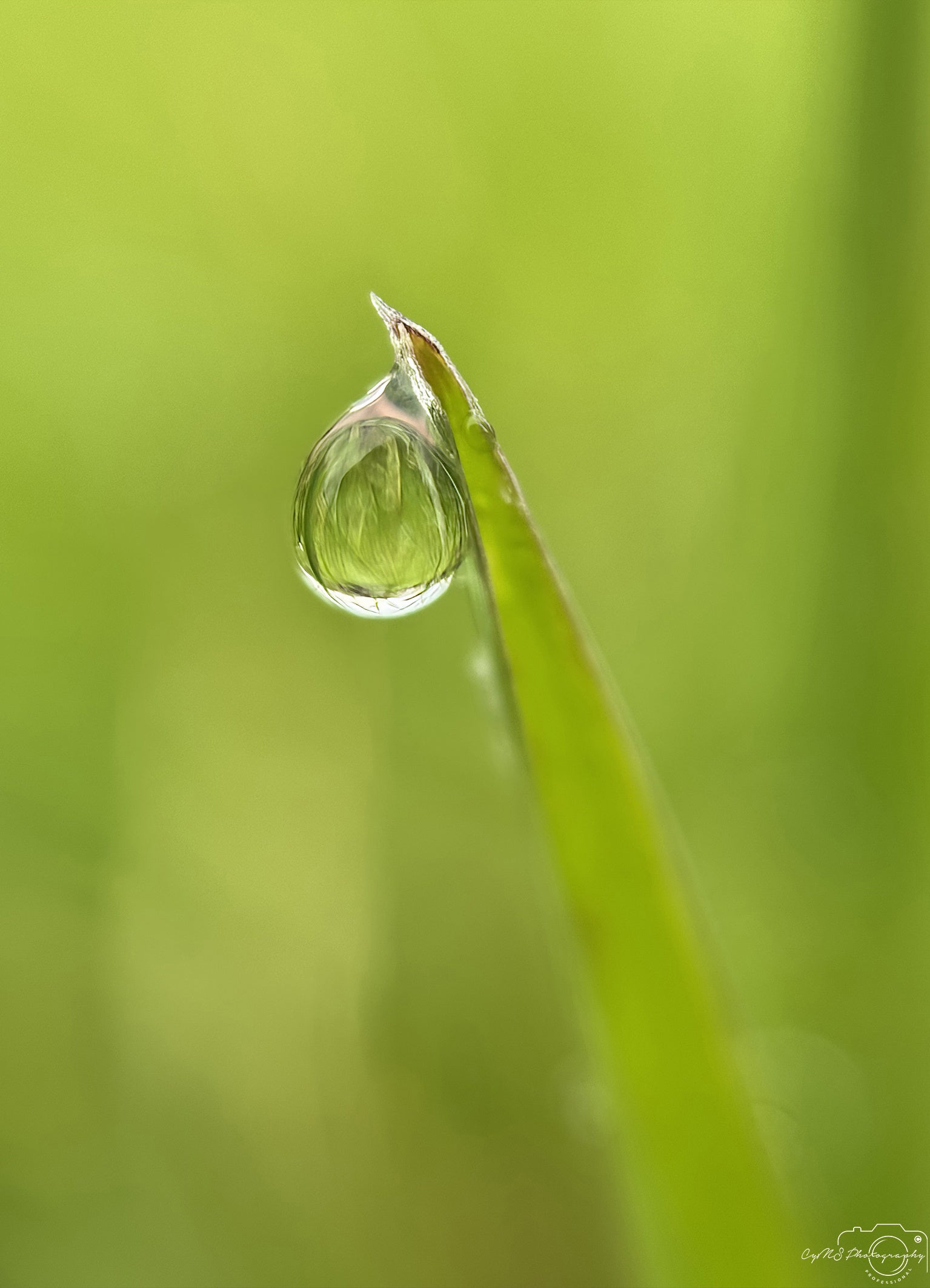 Une goutte de rosée se balance sur un fin brin d'herbe, sa présence à la fois délicate et saisissante. Le vert vif du feuillage environnant crée un décor parfait, faisant scintiller la goutte comme une minuscule lentille de lumière – une merveille silencieuse au cœur du calme matinal.
