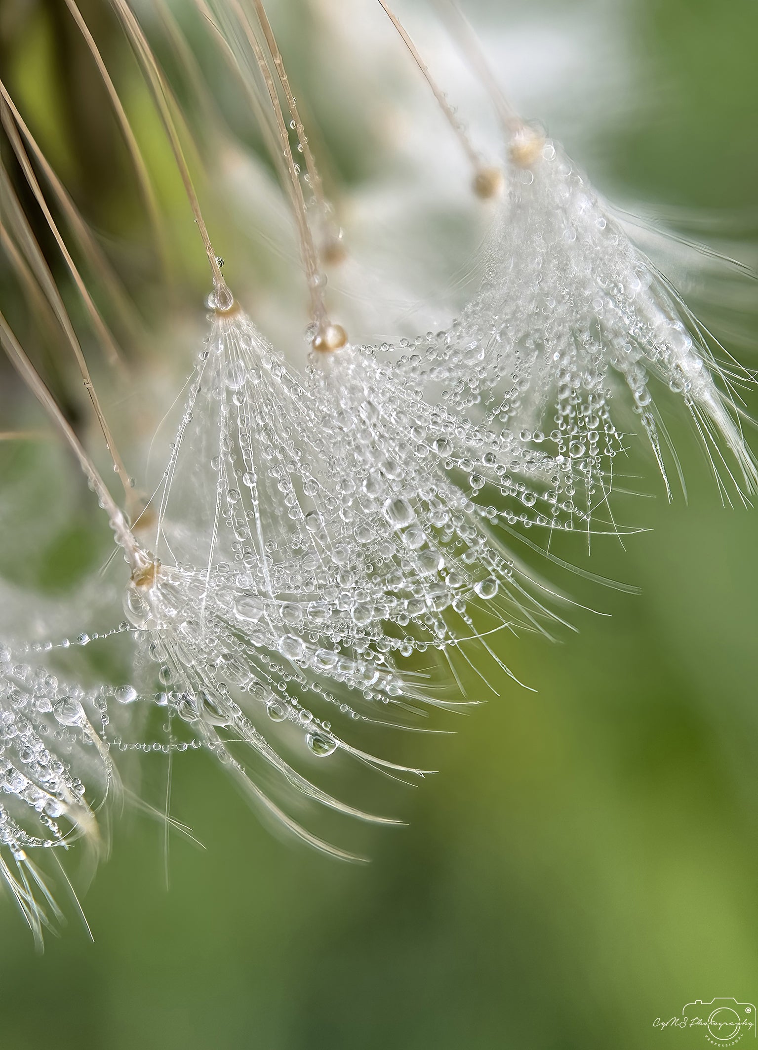De nombreuses petites gouttes de rosée s'accrochent délicatement aux fins filaments d'un pissenlit, capturées dans une magnifique macro qui révèle un monde d'élégance cachée. Chaque goutte scintille tel un cristal, reflétant la lumière avec un éclat discret. La structure complexe du pissenlit les soutient telle une couronne de joyaux matinaux.