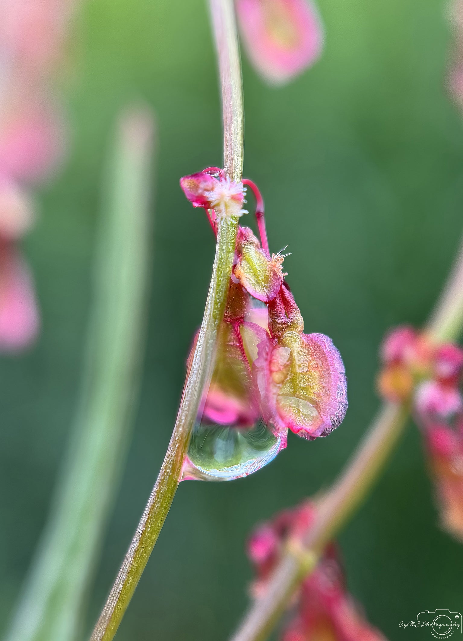 Une seule grosse goutte d'eau repose sur un fin brin de Rumex acetosa , dont la forme arrondie reflète les verts vibrants et les rouges profonds de l'herbe environnante. Le contraste entre la goutte et le brin délicat crée un moment de calme saisissant, comme si la nature elle-même s'arrêtait pour admirer la beauté du moindre détail.