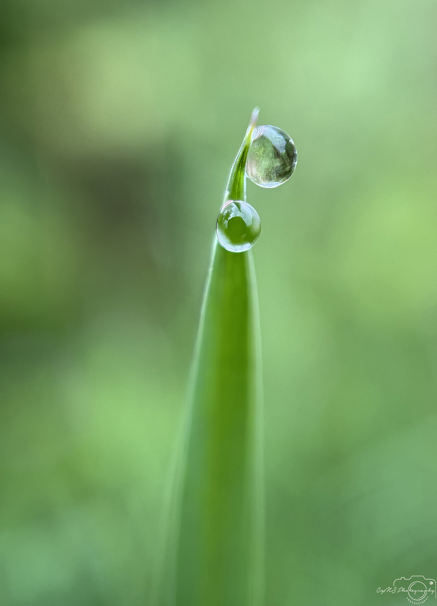 Deux gouttes de rosée se balancent délicatement entre les brins d'herbe, leur présence à la fois subtile et saisissante. Le vert vif du feuillage environnant crée un décor parfait, faisant scintiller les gouttelettes telles de minuscules lentilles de lumière – une merveille silencieuse au cœur du calme matinal.