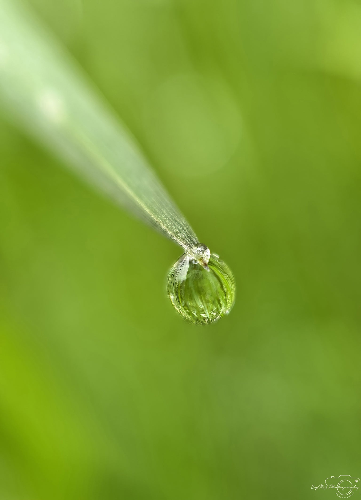 Une goutte de rosée se balance sur un fin brin d'herbe, sa présence à la fois délicate et saisissante. Le vert vif du feuillage environnant crée un décor parfait, faisant scintiller la goutte comme une minuscule lentille de lumière – une merveille silencieuse au cœur du calme matinal.