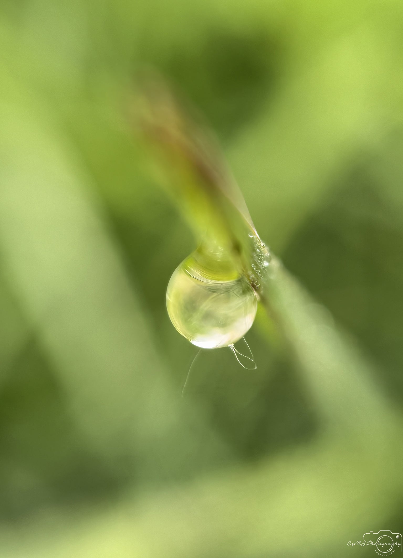 Une goutte de rosée se balance sur un fin brin d'herbe, sa présence à la fois délicate et saisissante. Le vert vif du feuillage environnant crée un décor parfait, faisant scintiller la goutte comme une minuscule lentille de lumière – une merveille silencieuse au cœur du calme matinal.
