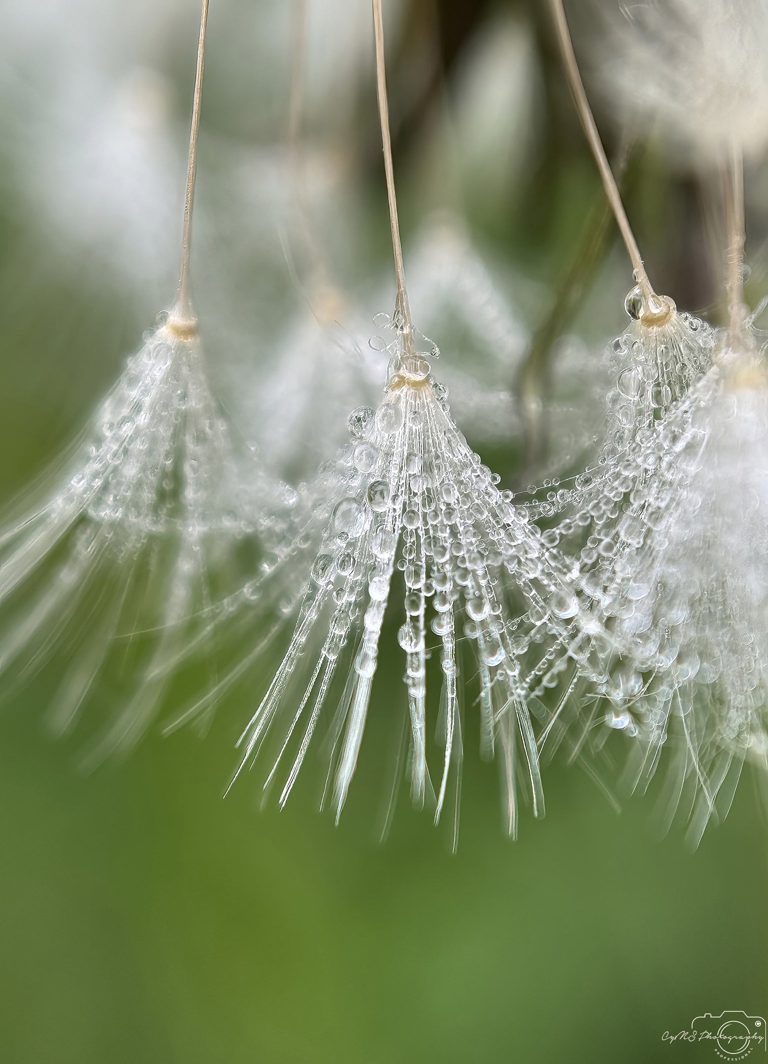 De nombreuses petites gouttes de rosée s'accrochent délicatement aux fins filaments d'un pissenlit, capturées dans une magnifique macro qui révèle un monde d'élégance cachée. Chaque goutte scintille tel un cristal, reflétant la lumière avec un éclat discret. La structure complexe du pissenlit les soutient telle une couronne de joyaux matinaux.