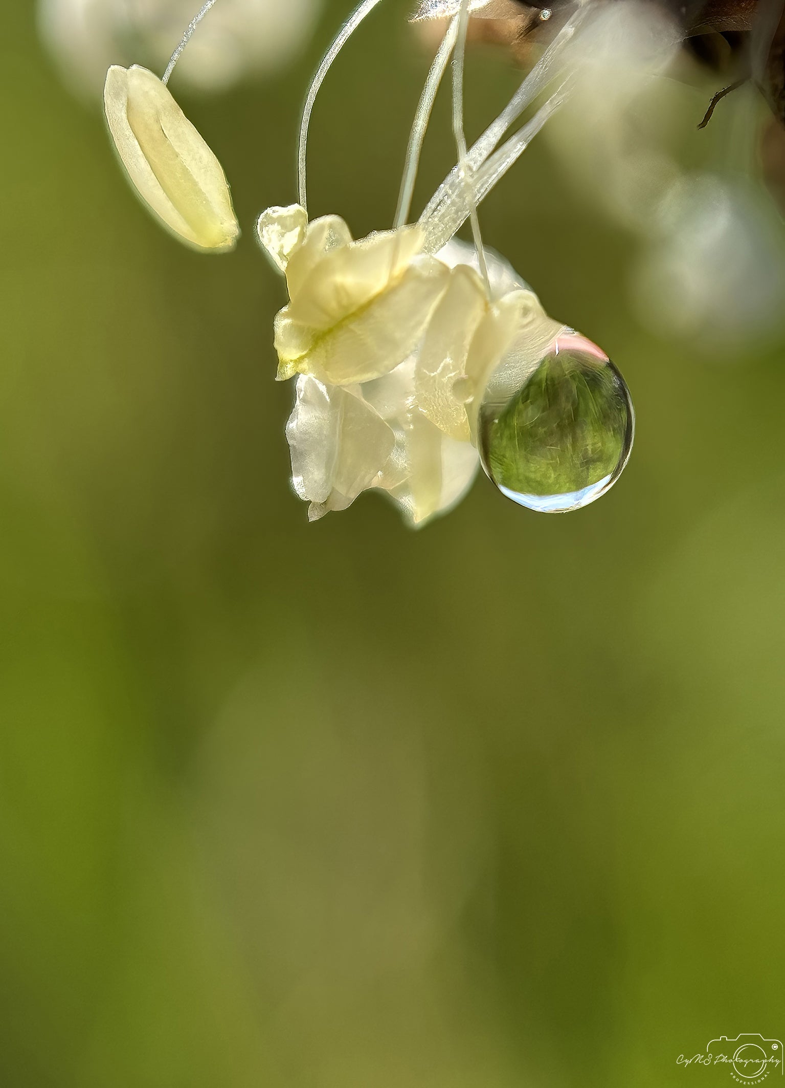 Au cœur de la fleur d'un Plantago lanceolata , une magnifique goutte d'eau repose, parfaitement posée. Elle reflète son environnement, capturant les douces teintes des pétales et de la verdure environnante, créant un petit monde miroitant au sein de sa surface scintillante. Son immobilité sublime la beauté délicate de la fleur, comme si elle contenait l'essence même de la scène.