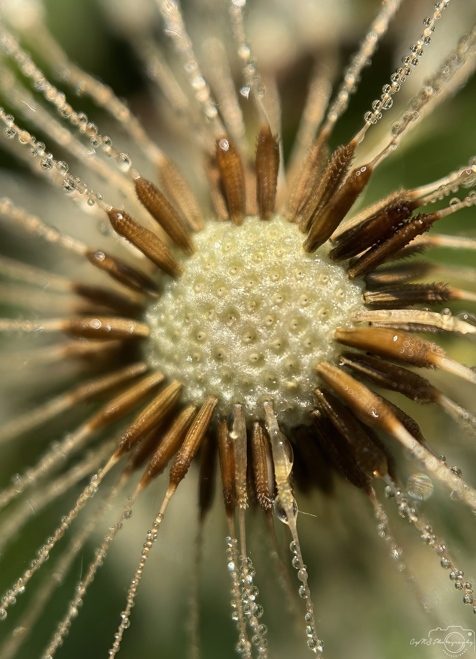De nombreuses petites gouttes de rosée s'accrochent délicatement aux fins filaments d'un pissenlit, capturées dans une magnifique macro qui révèle un monde d'élégance cachée. Chaque goutte scintille tel un cristal, reflétant la lumière avec un éclat discret. La structure complexe du pissenlit les soutient telle une couronne de joyaux matinaux.
