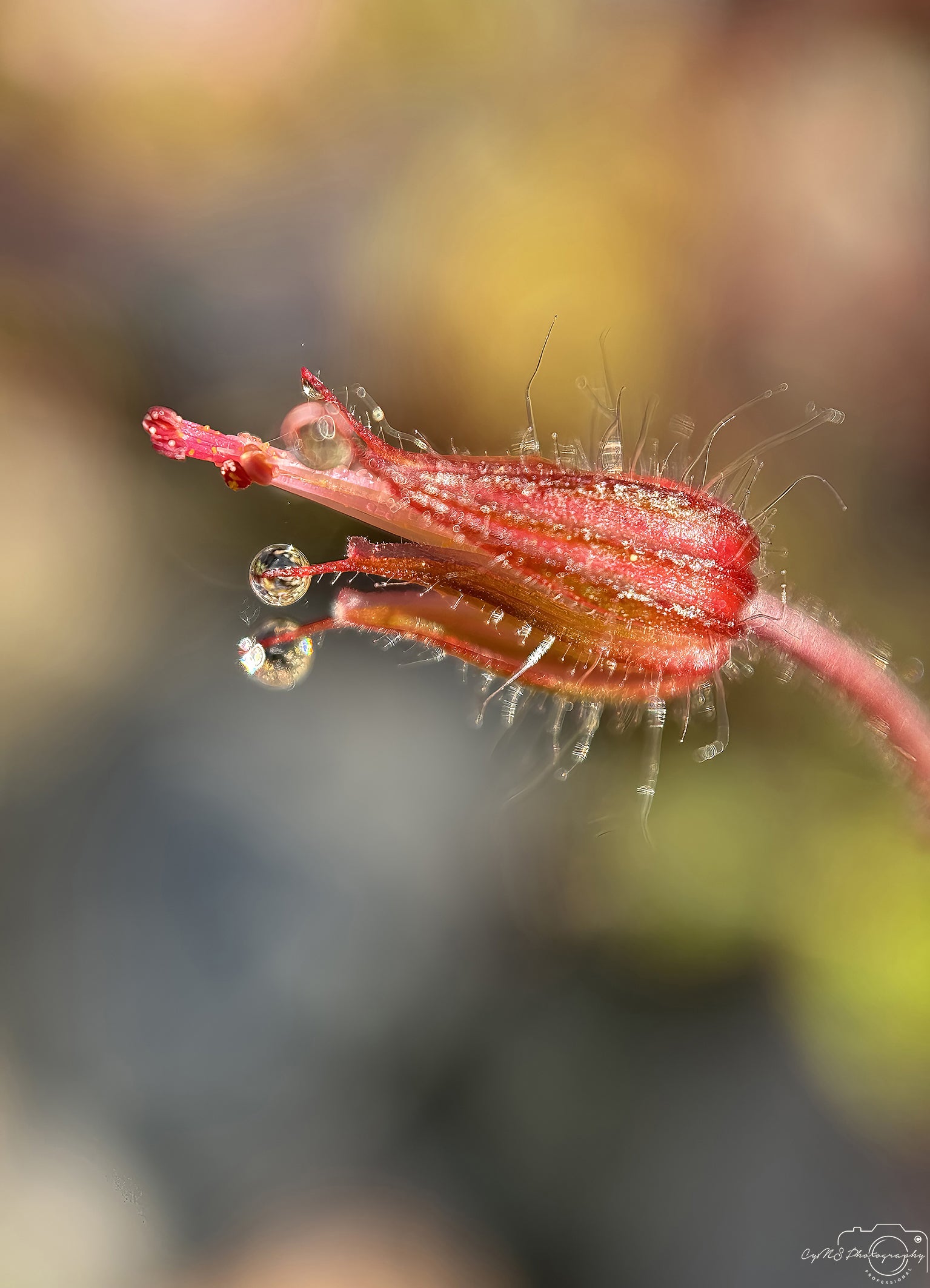 La fleur de Geranium robertianum reste fermée, son corps rouge vif visible sous ses pétales recourbés. Des gouttelettes de rosée, maintenant en forme de sphères parfaites, se déposent délicatement sur les bords extérieurs de la fleur, à ses extrémités. Ces minuscules perles sphériques captent la lumière, ajoutant un éclat subtil au rouge vif de la fleur fermée. Les gouttelettes s'accrochent délicatement, comme si la nature protégeait la fleur dans son calme matinal.