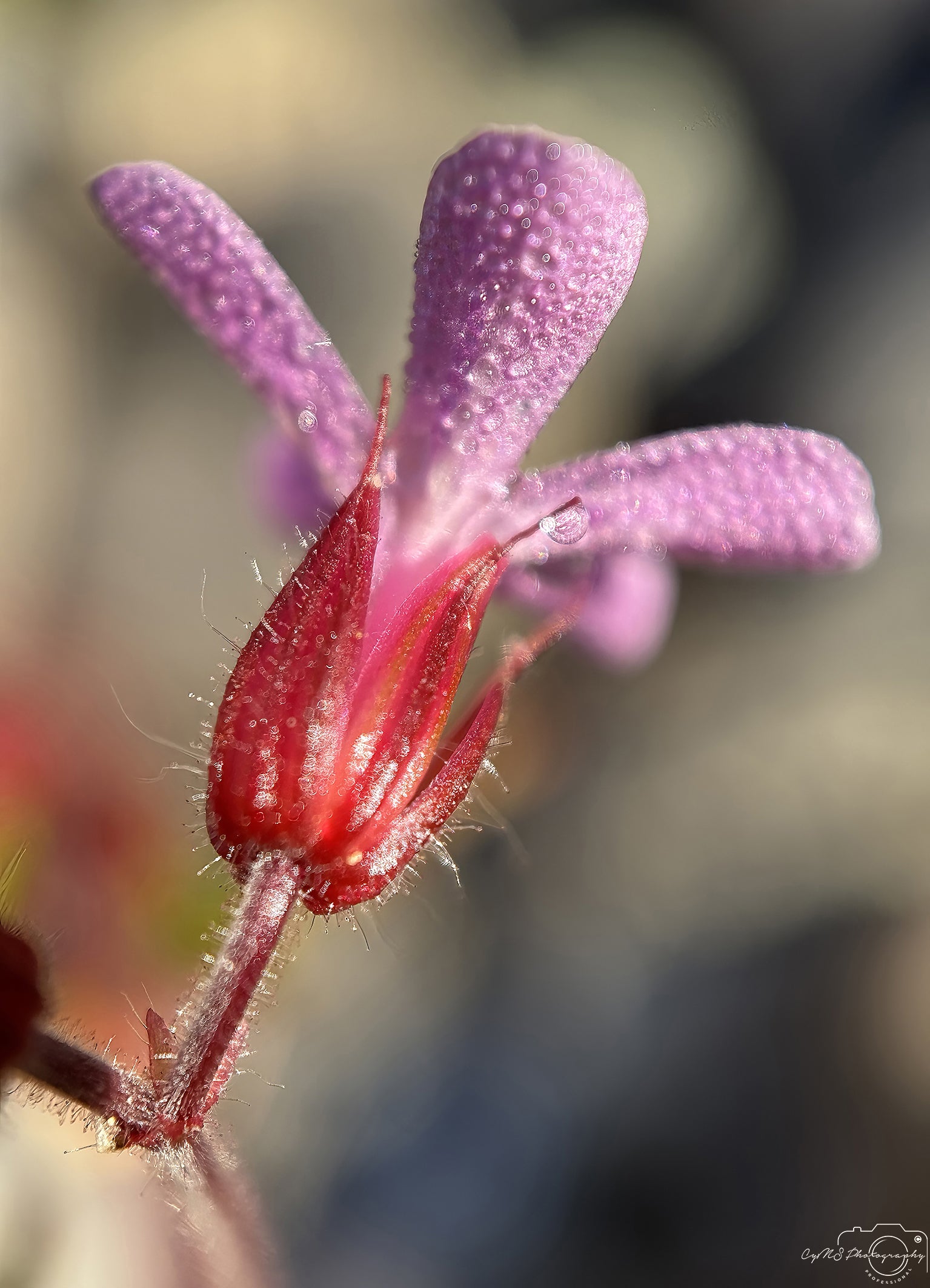 De nombreuses gouttes de rosée se déposent délicatement sur un géranium robertianum , chacune captant la lumière dans un scintillement discret. Les pétales, d'un magnifique rose, créent une douce toile de fond pour les gouttes, qui se posent tels de minuscules joyaux sur la fleur. Leur présence rehausse le charme délicat de la fleur, comme si la nature l'avait parée des plus beaux trésors du matin.