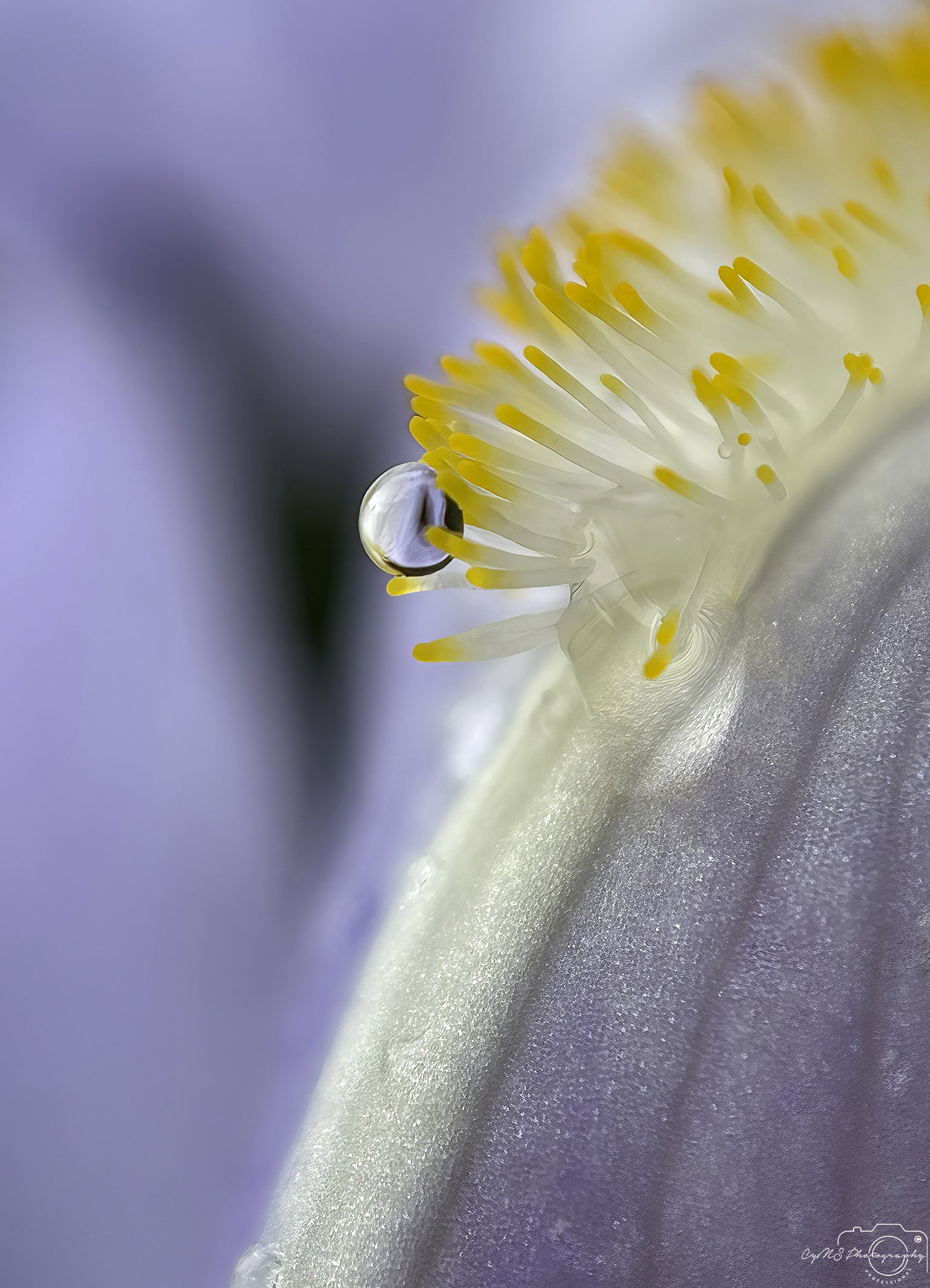 Sur un Iris pallida , nichée entre ses élégants pistils, se trouve une magnifique goutte d'eau translucide. Elle reflète un mélange de couleurs magnifiques – jaune, violet clair et blanc – qui capturent les teintes délicates de la fleur dans sa surface transparente et chatoyante. À l'intérieur de la goutte, le reflet forme une forme ludique, presque un « smiley » ou un émoji, comme si la nature elle-même adressait un clin d'œil joyeux et discret au spectateur.