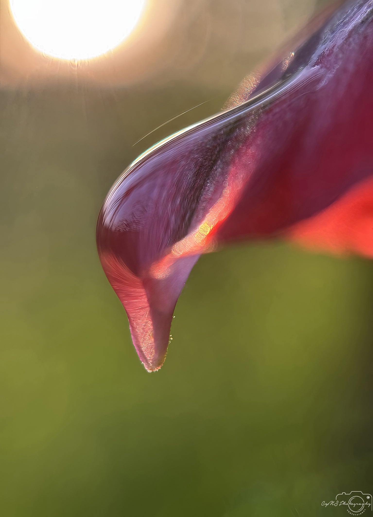 Sur une Tulipa agenensis , une magnifique goutte d'eau repose délicatement sur l'un de ses pétales éclatants. Sa forme et son reflet évoquent un oiseau s'élevant tout droit sorti d'une bande dessinée. Les couleurs de la goutte – tourbillonnant de rouges, d'oranges et de jaunes – dessinent la silhouette délicate de l'oiseau, comme si la goutte elle-même était une minuscule créature fantasque prête à s'envoler du cœur de la fleur.