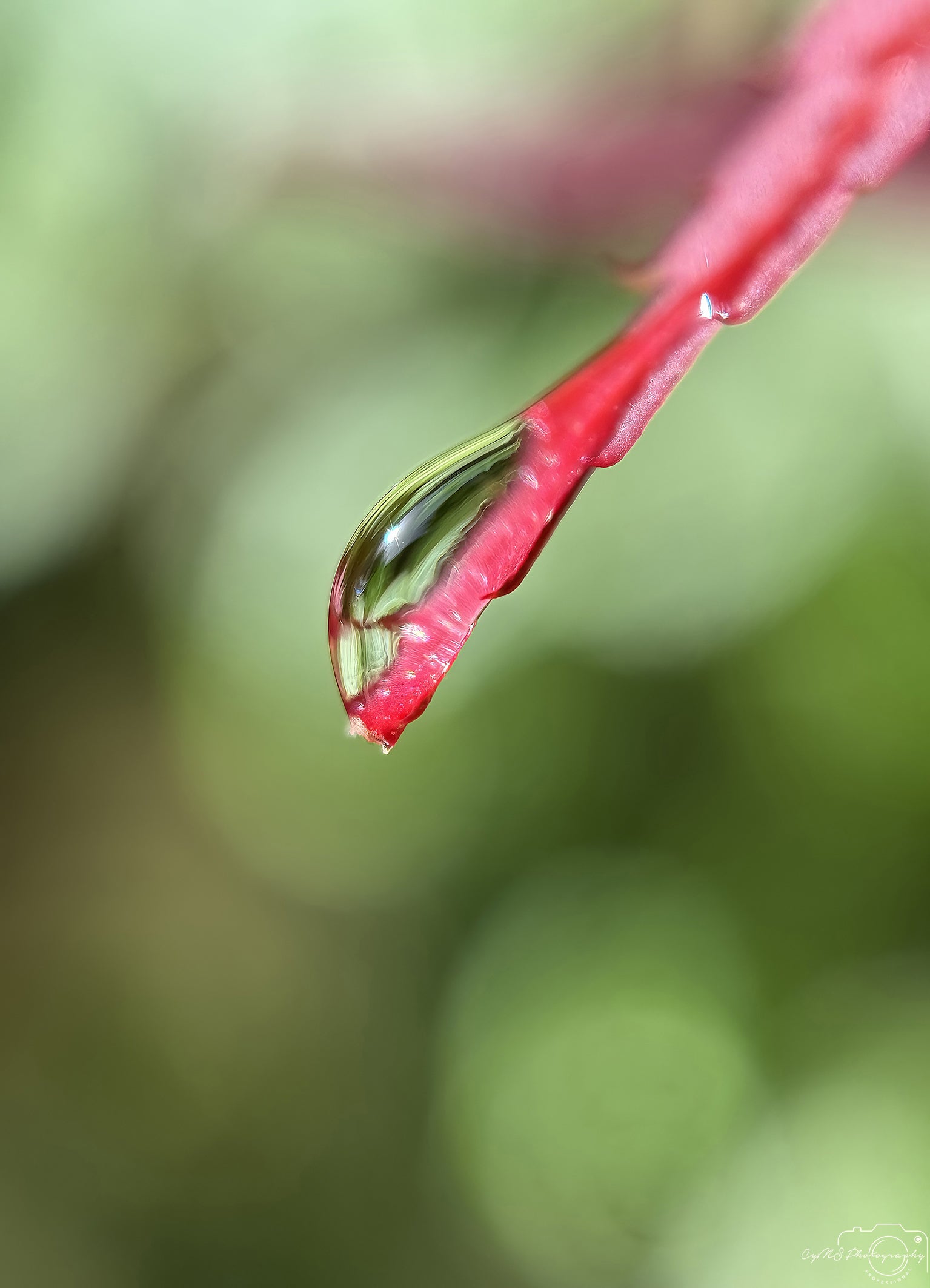 Sur un Acer palmatum , à l'extrémité d'une feuille rouge vif et magnifique, pourtant abîmée, se trouve une magnifique goutte d'eau, parfaitement taillée comme un minuscule vaisseau spatial. Sa surface lisse et réfléchissante reflète les bords dentelés de la feuille en dessous, et l'espace d'un instant, elle semble prête à s'envoler, emportant la merveille silencieuse du monde naturel vers l'inconnu.