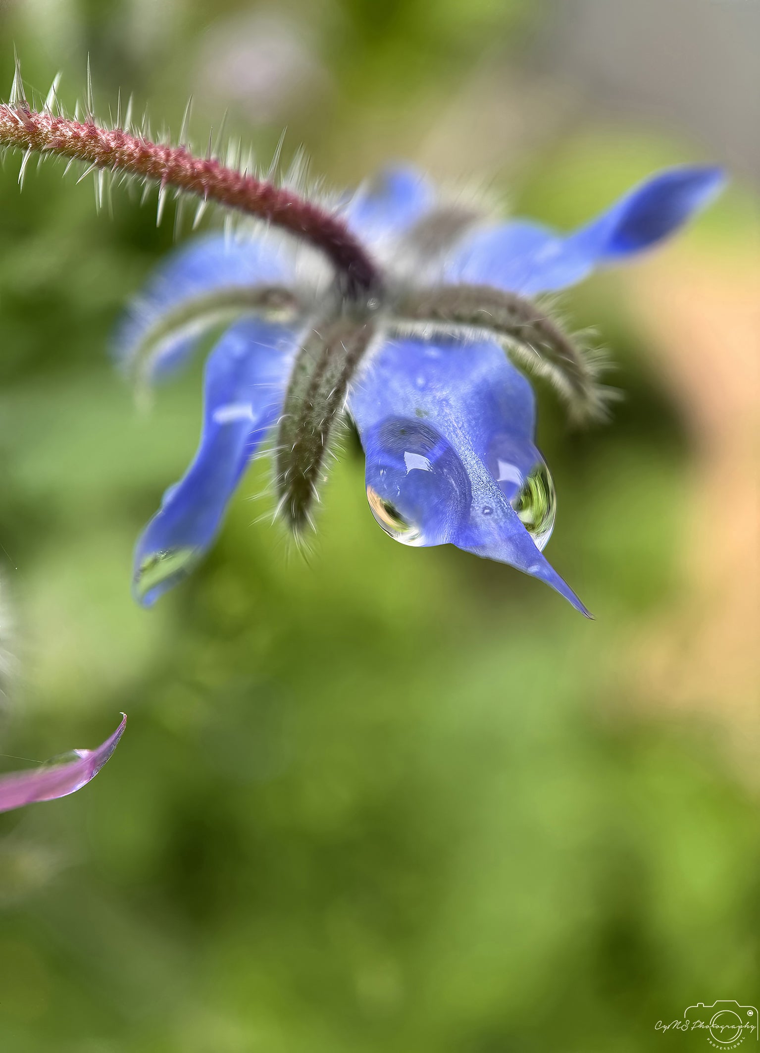 Sur la fleur étoilée d'une Borago officinalis , deux magnifiques gouttes d'eau reposent côte à côte, leurs surfaces lisses reflétant le bleu profond des pétales. Ensemble, elles ressemblent aux yeux d'une petite créature ailée, perchée et posée, comme si elle observait le visiteur avec une curiosité discrète. Les gouttes scintillent tels des joyaux, subtilement vivantes dans leur immobilité, comme si la nature elle-même avait façonné cet instant délicat et fugace.