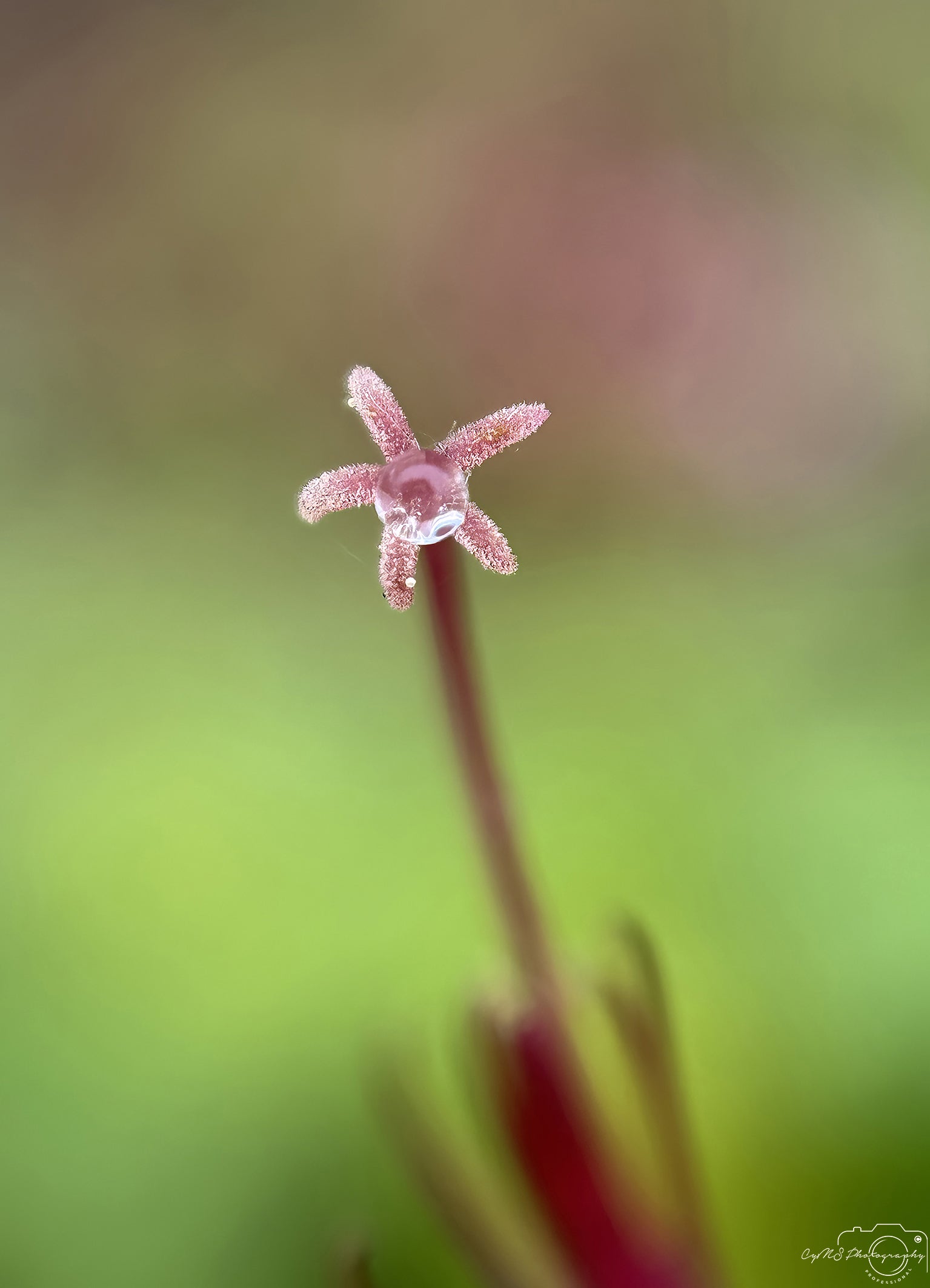 À l'extrémité d'une longue tige, au cœur même de la fleur du Géranium macrorrhizum, se trouve une magnifique goutte d'eau, vive et limpide. La fleur, avec son doux mélange de pétales rougeâtres, roses et blancs, se détache avec éclat, tandis que tout autour paraît délavé ou flou. Cette goutte unique capture parfaitement la lumière, tel un délicat joyau bercé par la nature. Seules la fleur et la goutte d'eau conservent toute leur couleur et leur clarté, attirant le regard sur cet instant à la fois paisible et saisissant.