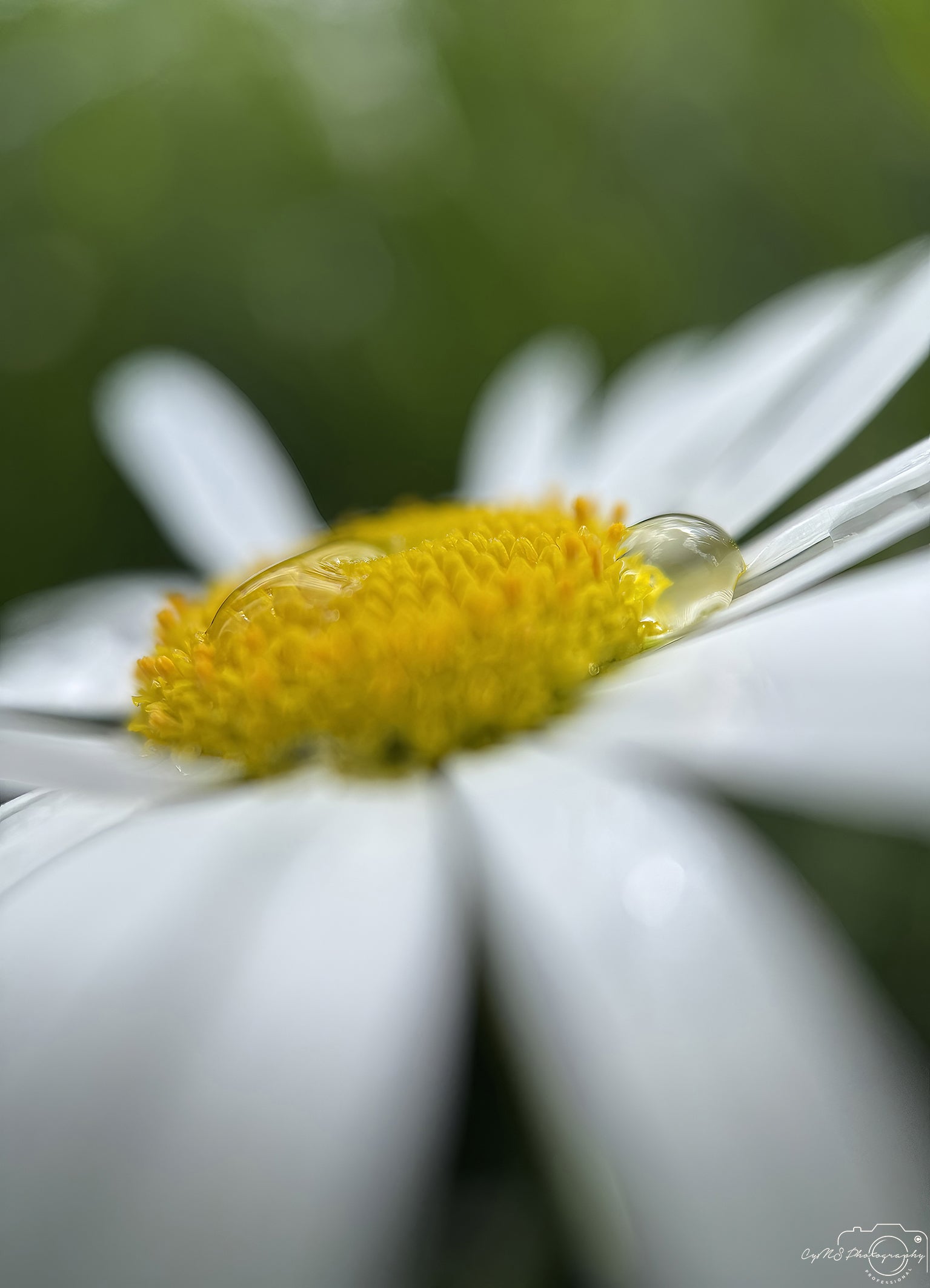 Près du cœur jaune vif de ce même Leucanthemum vulgare , une magnifique goutte d'eau cristalline repose. Elle capte la lumière comme du verre, reflétant les verts environnants avec une délicate précision. Nichée parmi les doux pétales blancs, elle ajoute une touche de magie discrète au cœur de la fleur. Cette minuscule sphère renferme une scène entière, un monde caché encadré par la douceur de la nature.