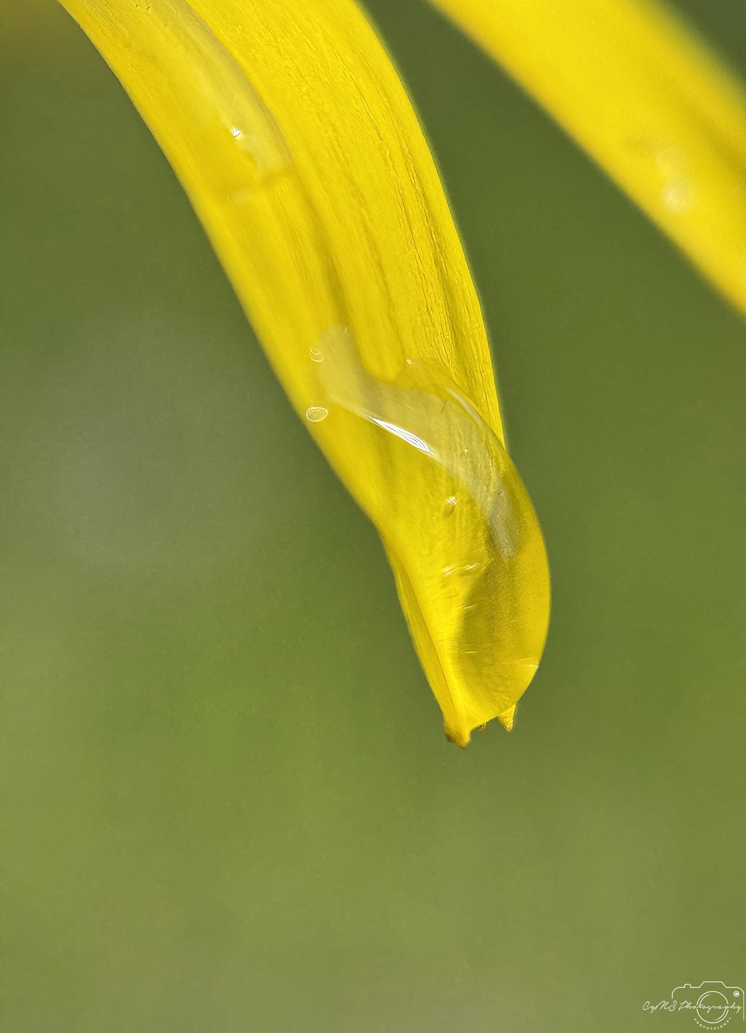 Une grosse goutte d'eau s'accroche à l'extrémité d'un pétale jaune vif du Tragopogon pratensis , le salsifis des prés, captant la lumière matinale tel un globe de cristal. Le pétale, large et légèrement effilé, retient la goutte comme s'il l'offrait au ciel ; sa teinte dorée est intensifiée par l'humidité. La fleur elle-même, avec sa composition en forme de soleil et sa couleur éclatante, rayonne d'une élégance sauvage, mais c'est cette goutte unique qui attire le regard : elle magnifie la texture du pétale, réfracte le monde qui l'entoure et transforme un instant fugace en une douce lumière.