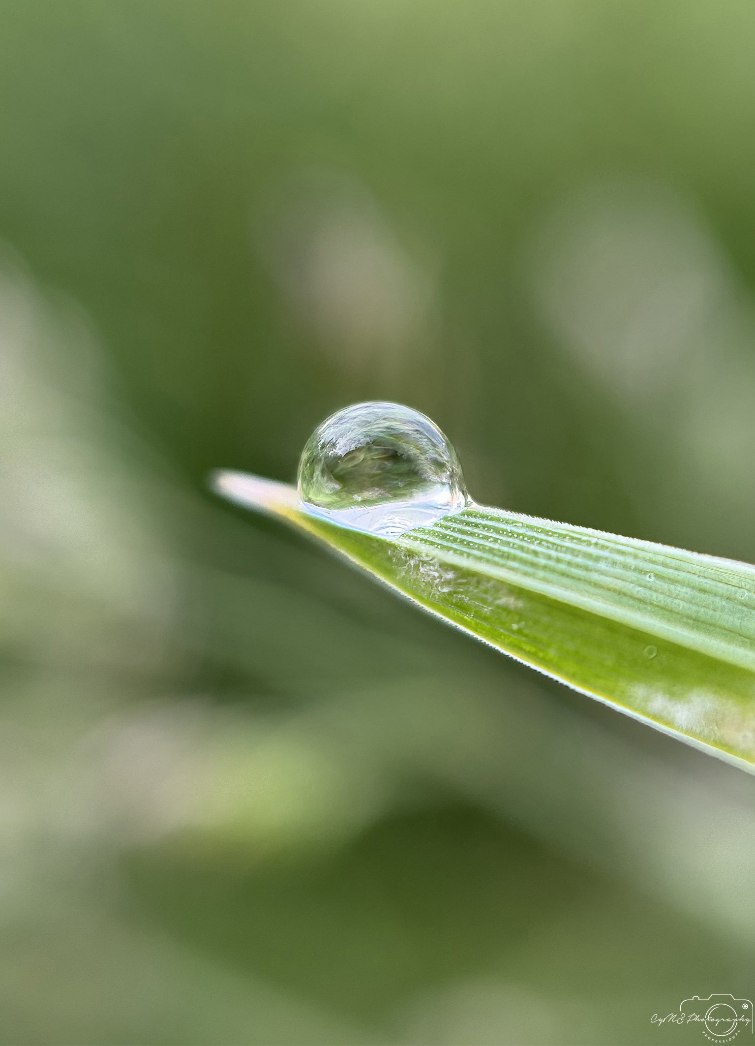 Une goutte de rosée se balance sur un fin brin d'herbe, sa présence délicate mais saisissante. Le vert vif du feuillage environnant crée un décor parfait, faisant scintiller la gouttelette telle une minuscule lentille de lumière – une merveille silencieuse au cœur du calme matinal. La lame elle-même se courbe avec une telle tension et une telle grâce qu'elle ressemble à un bateau à moteur lancé à pleine vitesse, fendant l'air immobile plutôt que l'eau, propulsé non par des moteurs, mais par la force silencieuse de la nature.
