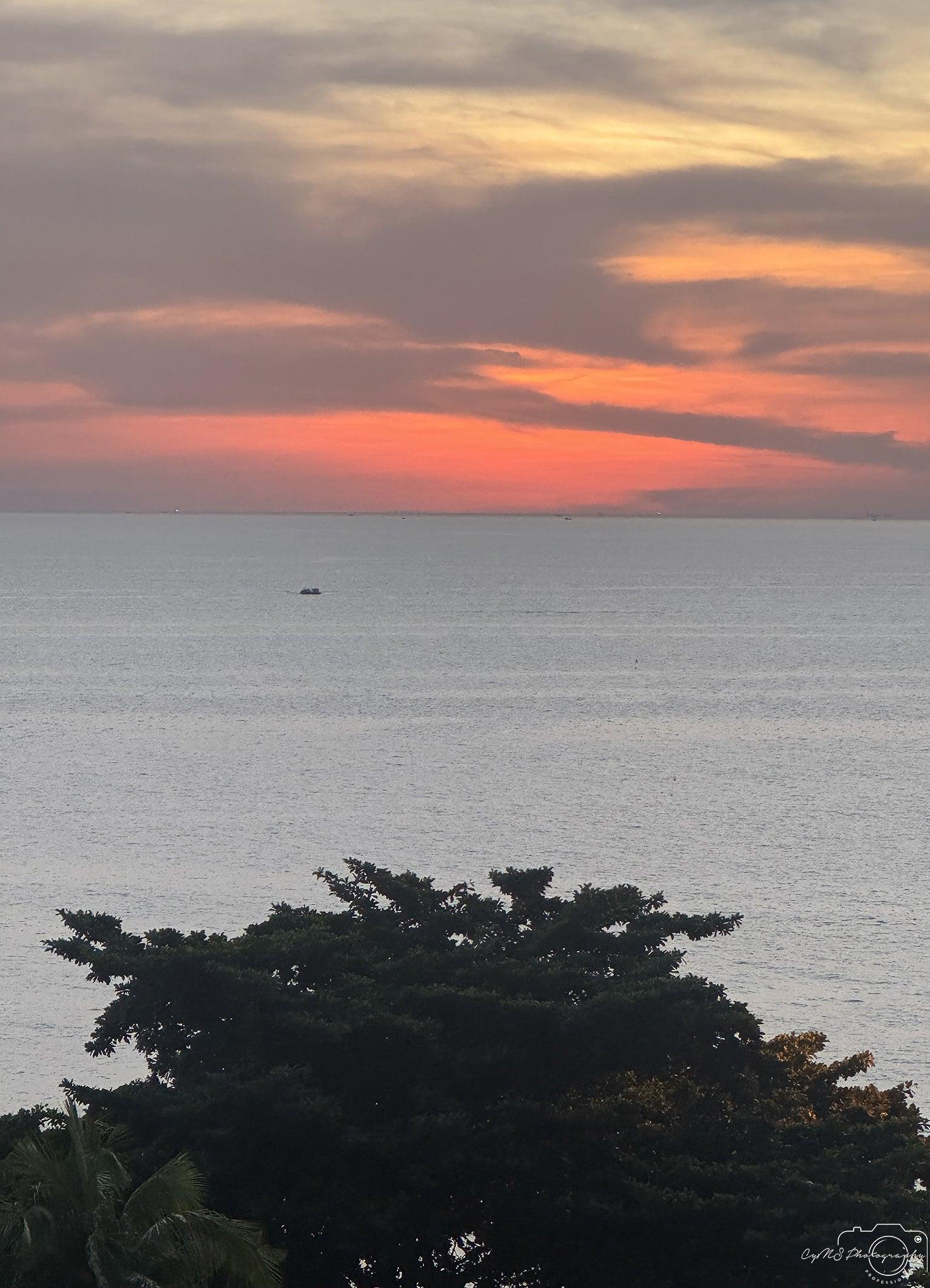 Dans un paysage lointain, les nuages brillent d'une teinte rougeâtre, persistant dans le ciel nocturne. En contrebas, l'océan s'étend dans un bleu clair doux, sa surface calme reflétant la faible lumière d'en haut. Un petit bateau repose presque inaperçu sur l'océan, immobile face à la vaste étendue d'eau. La nuit est calme, l'horizon se fondant doucement dans les eaux paisibles, créant une atmosphère sereine et presque onirique. Les couleurs du ciel et de l'océan créent ensemble une scène tranquille, mais mystérieuse, qui semble suspendue dans le temps.