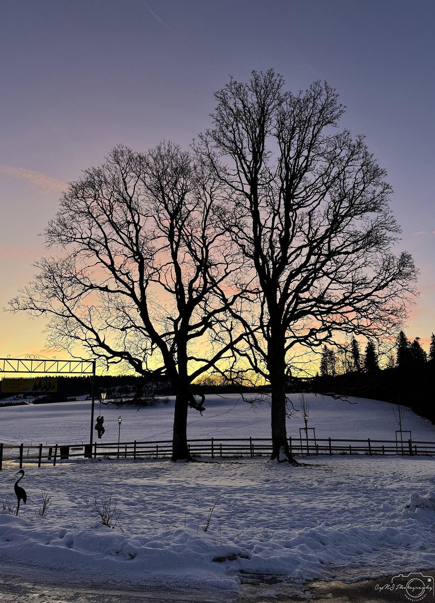 Deux magnifiques arbres se dressent au petit matin, leurs branches nues et austères sur un ciel éclatant de couleurs vives. L'horizon est inondé de teintes de rose, de violet et d'orange doux, créant un dégradé semblable à un arc-en-ciel qui semble s'étendre à l'infini dans le ciel. L'air est vif et froid, la neige recouvrant le sol autour des arbres, sa surface intacte et scintillante dans la lumière du matin. La scène est sereine et calme, tandis que le calme du paysage enneigé contraste magnifiquement avec les couleurs brillantes, presque surréalistes du ciel.