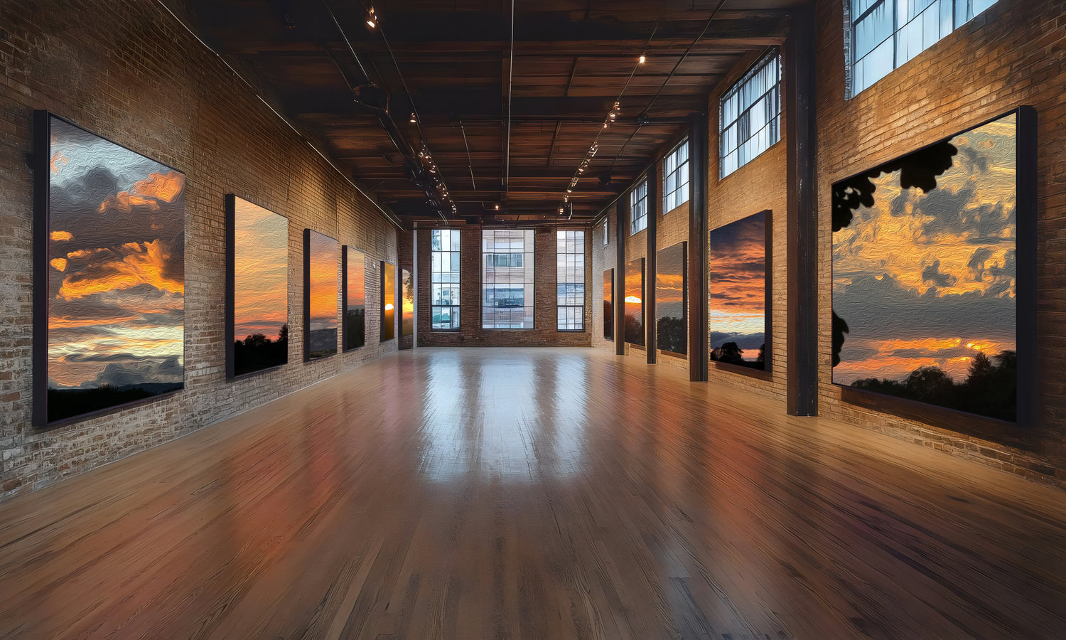 In a spacious, empty gallery, large oil paintings of clouds at sunset line each wall, creating a stunning visual experience. The warm hues of orange, pink, and gold fill the room with a calming, inviting atmosphere. Each frame captures the beauty and serenity of a sunset, offering a moment of peaceful reflection. The paintings transform the space into a tranquil haven, where nature’s beauty takes center stage.