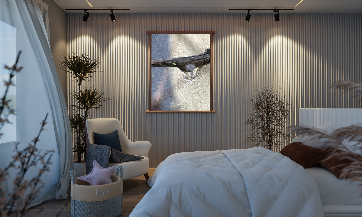 In a beautiful hotel bedroom adorned in light blue, white, and grey, a framed image captures the elegance of a single water drop resting on the curve of a branch. The scene radiates calmness, as if time itself has paused to admire its delicate balance. Soft hues and gentle lighting enhance the peaceful atmosphere, inviting relaxation and reflection. A quiet reminder of nature’s simple yet profound beauty.
