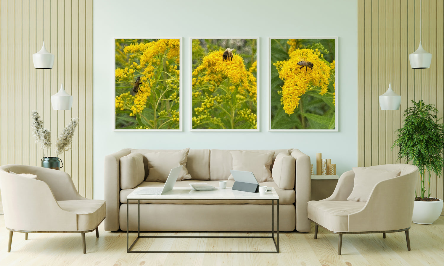 In a bright white living room, three framed paintings capture a perfect moment—a yellow flower and a bee in motion. The soft beige sofa and armchairs add warmth, complementing the delicate yet powerful imagery on the wall. Each painting tells a story of nature’s rhythm, where the hardworking bee symbolizes dedication and unity. A timeless tribute to effort, beauty, and the balance of life.