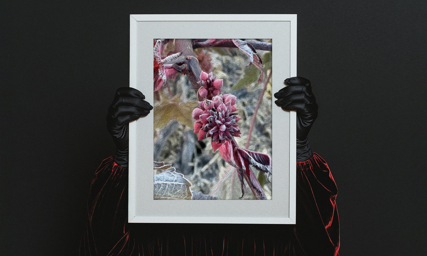An elegant woman stands in a dark-walled room, her face hidden as she holds the ornate frame. Within it, a frozen plant glows softly, its icy leaves touched by the breath of morning mist. Hints of crimson seep into the painted frost, blending with the deep red of her velvet gown. Wrapped in silence, she lingers—her gloved hands steady, as if caught between reality and art.