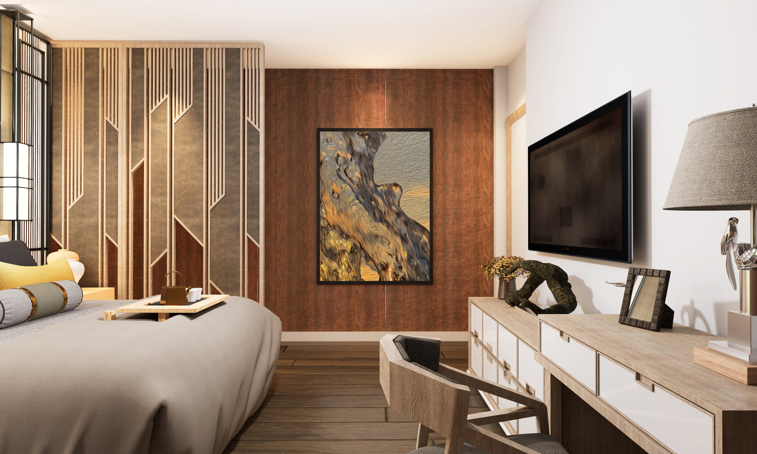 In a beautiful hotel room, a framed picture of a fountain hangs on the wall, capturing the morning sun shining through the flowing water. Golden hues and soft colors reflect across the elegant space, filling it with warmth and serenity. The artwork brings a sense of calm, as if the gentle sounds of water could almost be heard. A perfect blend of luxury and tranquility welcomes the new day.