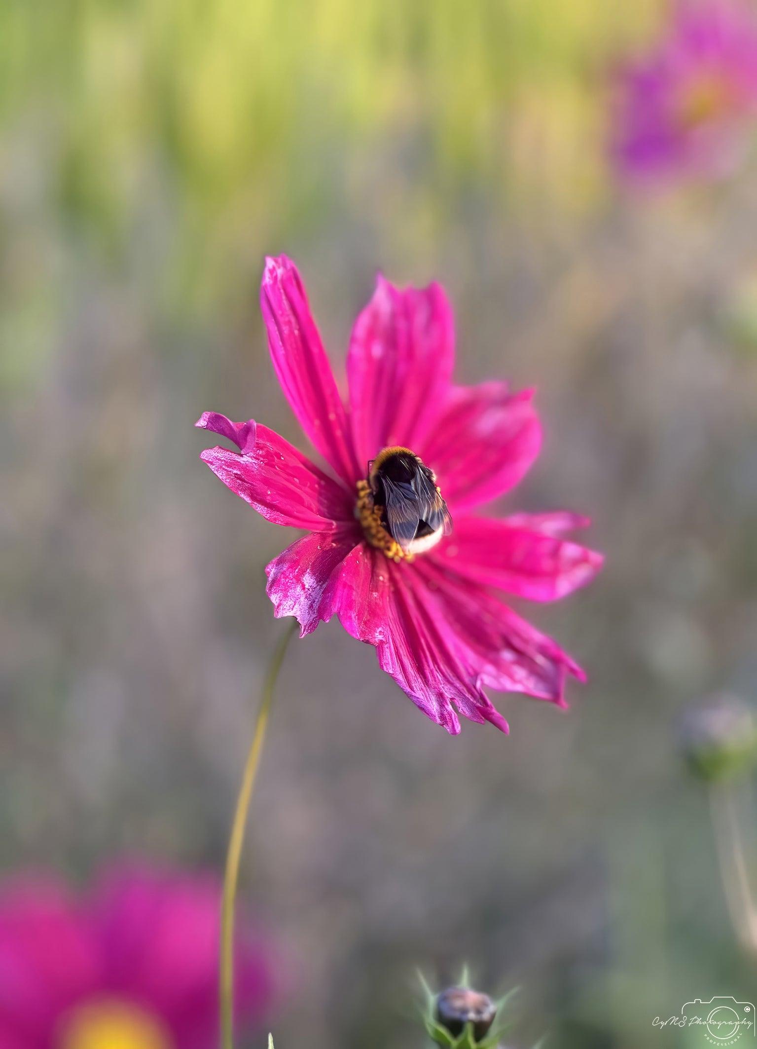 In this stunning shot, a bubble bee is captured delicately perched on a vibrant dark pink Cosmos flower, eagerly collecting every drop of nectar. The bee’s fuzzy, golden body contrasts beautifully with the rich, vivid hues of the flower, creating a harmonious balance of nature. The flower’s petals, soft and velvety, seem to glow in the light, while the bee works tirelessly, its tiny wings gently vibrating as it moves from petal to petal. This image perfectly captures the quiet beauty of nature, showing the symbiotic relationship between the bee and the flower, both at the height of their natural purpose. The scene feels almost magical, as if time itself slows down to witness this delicate moment.