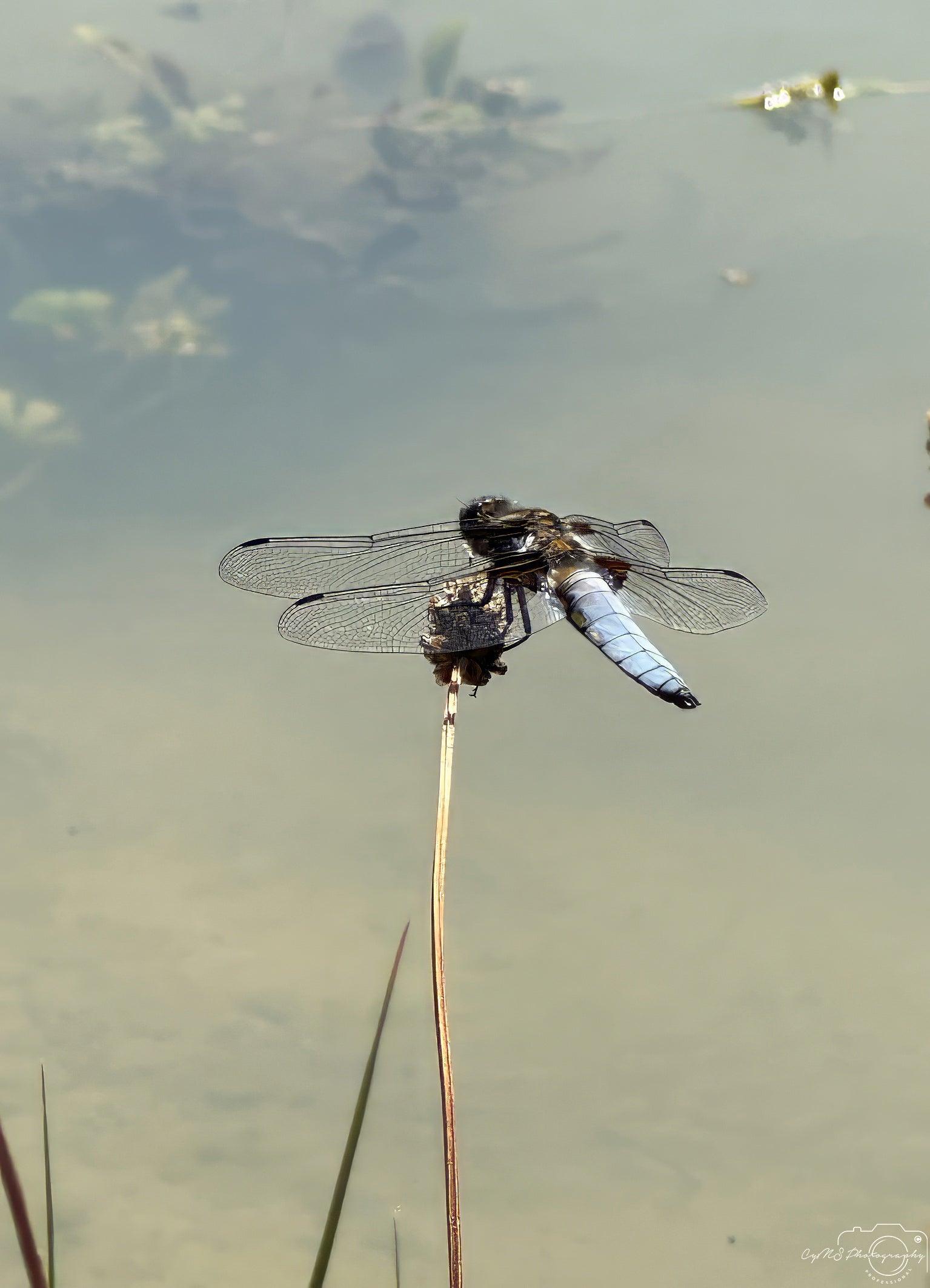A dragonfly lies delicately on a tige near a tranquil frog pond, its wings gently resting as it takes a brief pause. The dragonfly’s body, a bright and vivid light blue, stands out beautifully against the surrounding greenery and the calm surface of the water. The vibrant hue of its body catches the light, adding an ethereal touch to the scene. As it rests on the tige, the dragonfly seems to be in perfect harmony with its surroundings, a moment of stillness in the otherwise lively pond ecosystem.