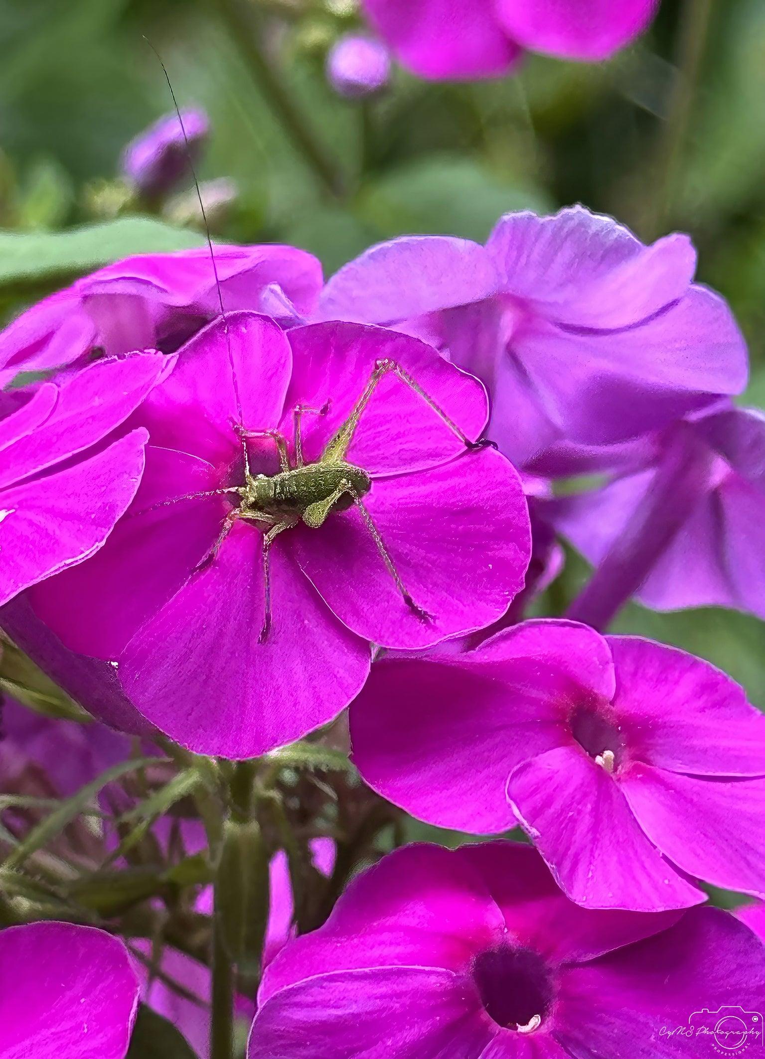 A green cricket lies gently on top of a beautiful pink Phlox paniculata, its delicate body blending harmoniously with the soft petals. The cricket’s extremely long legs and, especially, its elongated antennas create a striking contrast against the vibrant pink flowers, drawing attention to its fascinating details. The soft pink blooms seem to frame the cricket perfectly, highlighting the insect’s unique features and graceful presence. This image captures the peaceful coexistence between the cricket and the flower, showcasing nature’s intricate beauty in perfect harmony.