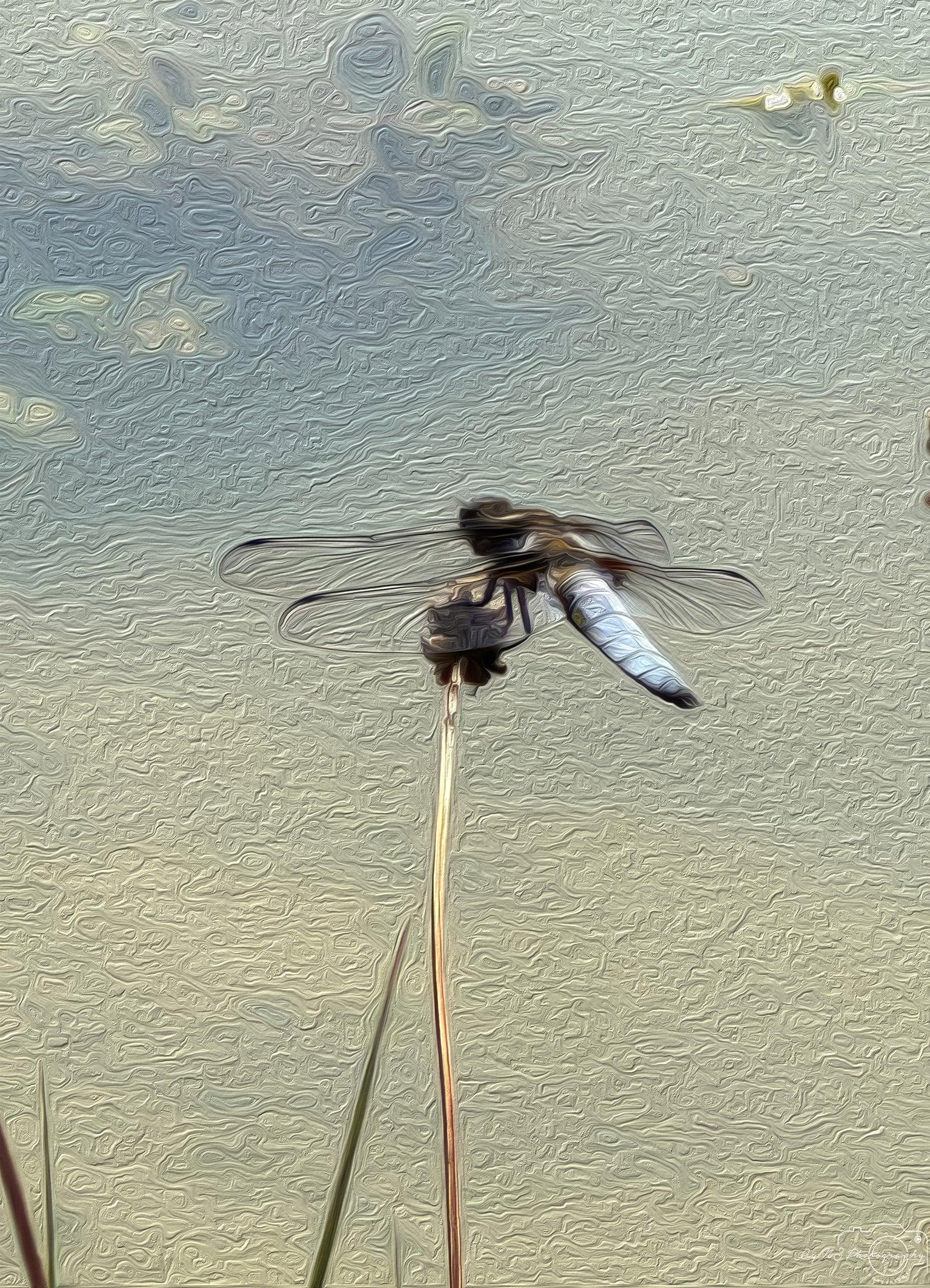 A dragonfly lies delicately on a tige near a tranquil frog pond, its wings gently resting as it takes a brief pause. The dragonfly’s body, a bright and vivid light blue, stands out beautifully against the surrounding greenery and the calm surface of the water. The vibrant hue of its body catches the light, adding an ethereal touch to the scene. As it rests on the tige, the dragonfly seems to be in perfect harmony with its surroundings, a moment of stillness in the otherwise lively pond ecosystem.
