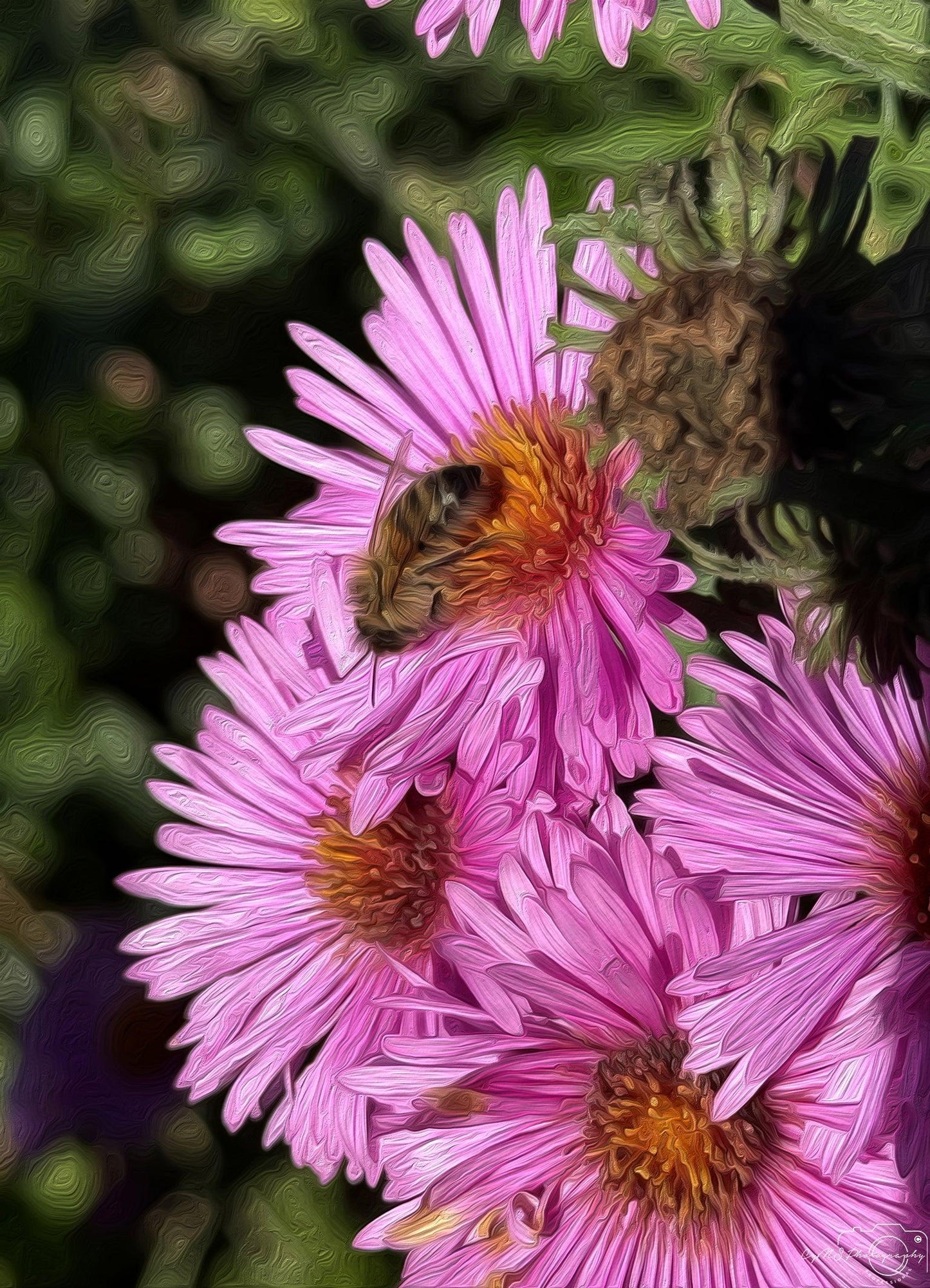 A bee is busily doing its job, resting atop a cluster of Symphyotrichum novae-angliae flowers, its body gently nestled among the stunning blooms. The flowers, with their incredibly vibrant, soft rose petals, create a breathtaking contrast against the bee’s golden fuzz. The rich, pretty rose hue of the petals seems to glow in the light, while the bee moves from flower to flower, diligently collecting nectar. This image beautifully captures the quiet yet vital role of the bee, showcasing the harmonious interaction between the pollinator and the delicate flowers in a moment of natural perfection.
