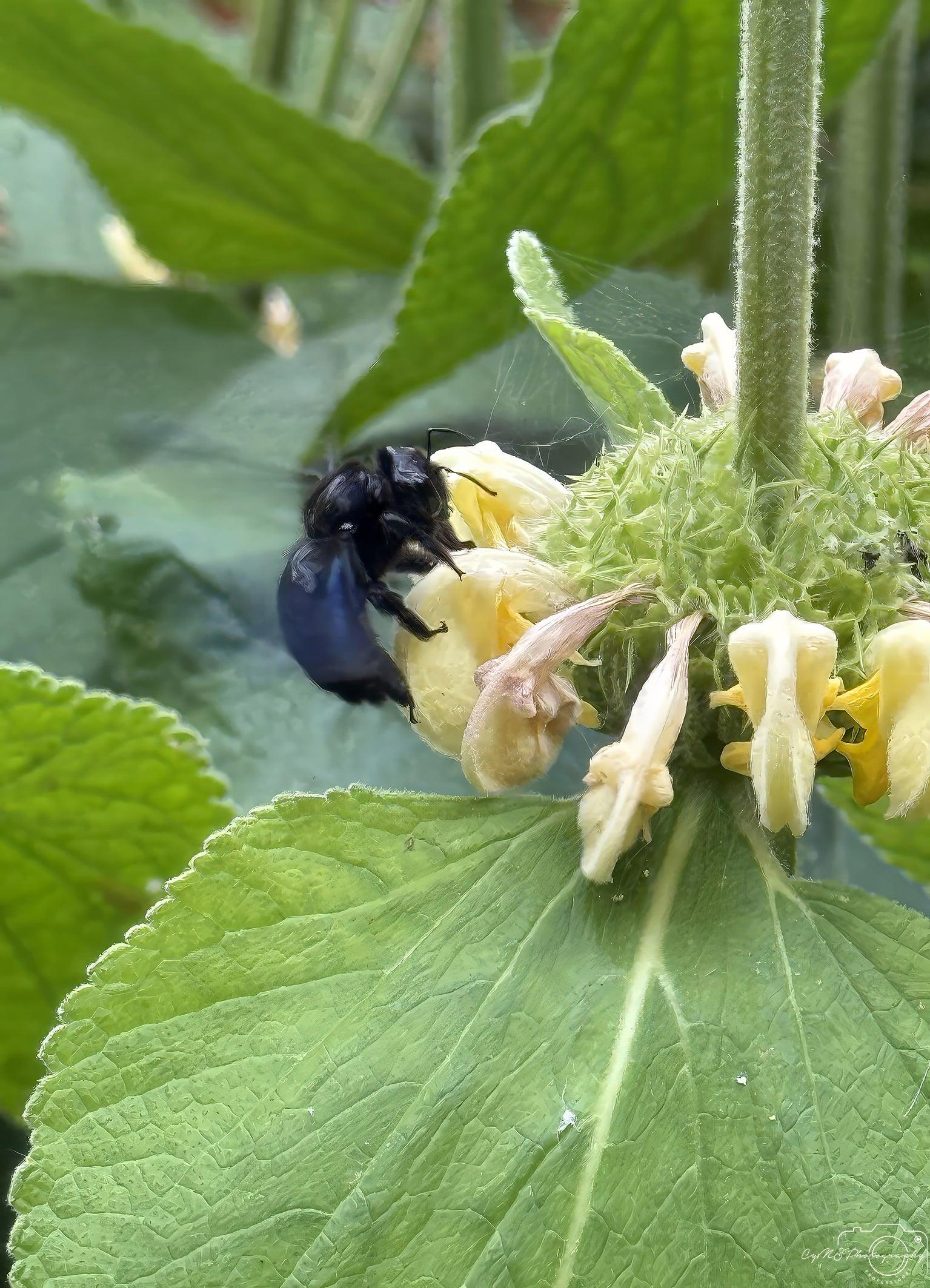 From the side, we see a graceful giant dark honey bee expertly hovering in mid-air, its wings a blur of motion as it stays perfectly balanced while collecting nectar from a Phlomis fruticosa flower. The bee’s large, dark body contrasts beautifully with the delicate, pale yellow blooms, capturing the precision and skill of this remarkable pollinator. With its legs gently touching the flower’s tubular petals, the bee is doing a great job of gathering nectar, showcasing its impressive ability to stay in mid-air while performing this essential task. This image beautifully highlights the bee’s incredible focus and the harmonious interaction between nature’s creatures and plants.