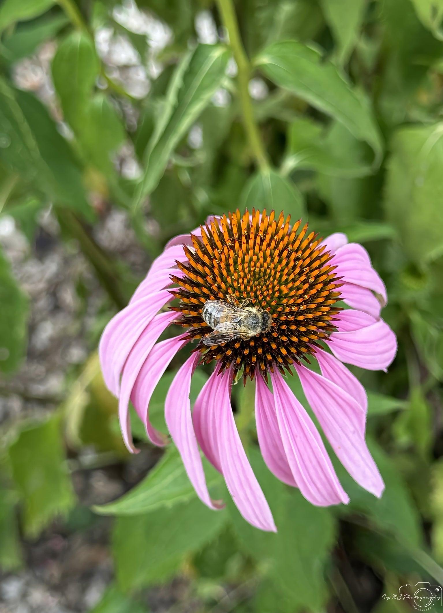 A bee is doing its dance on an Echinacea purpurea flower, its vibrant movements adding life to the scene. The Echinacea features vivid pink petals, creating a stunning contrast with its beautiful orange and black center. As the bee collects nectar, its tiny body flits gracefully from petal to petal, in perfect rhythm with the flower. The colorful blooms and the bee's busy dance create a beautiful moment of nature at work, highlighting the essential role of pollination and the intricate beauty of both the bee and the flower.