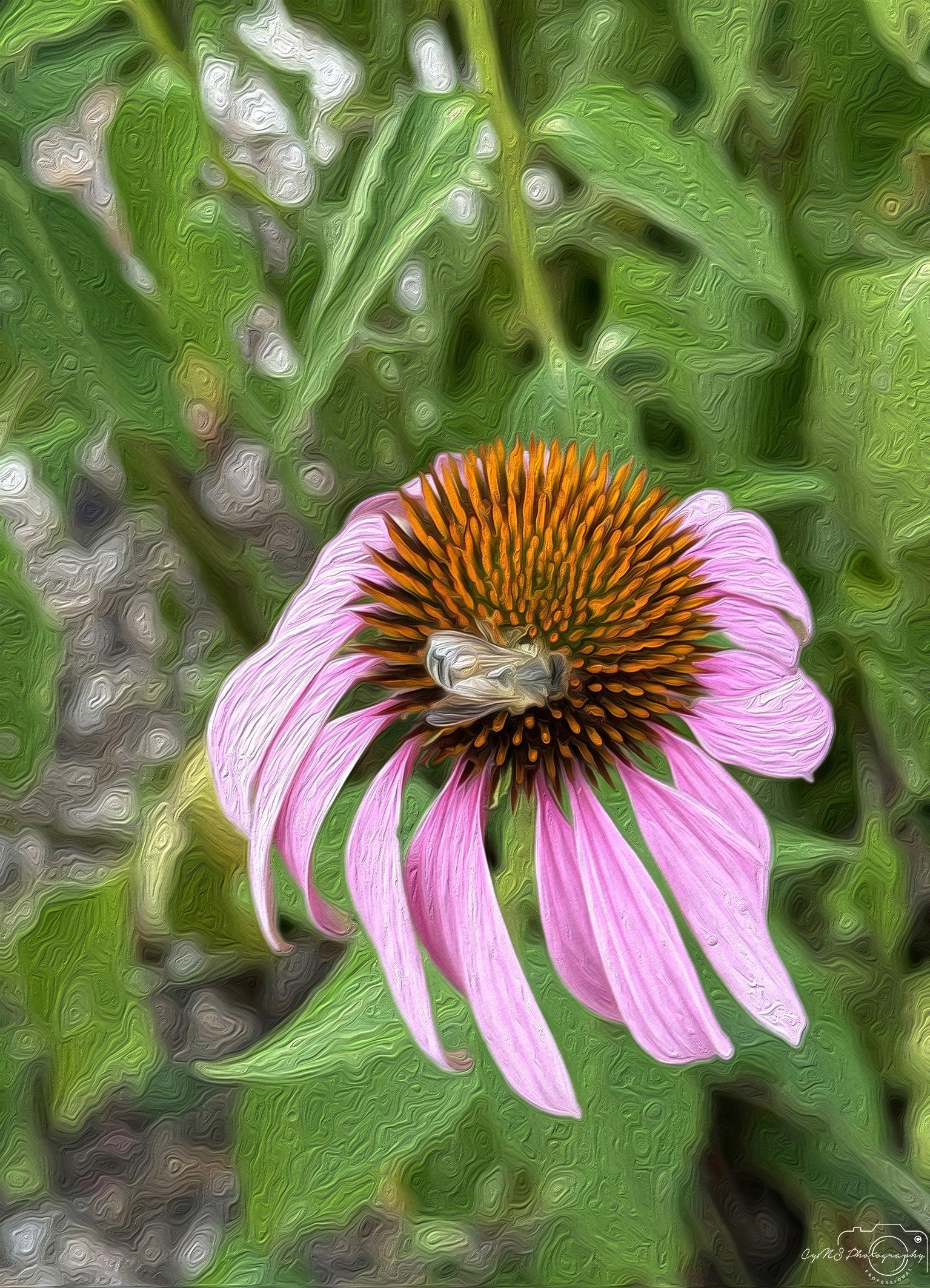 A bee is doing its dance on an Echinacea purpurea flower, its vibrant movements adding life to the scene. The Echinacea features vivid pink petals, creating a stunning contrast with its beautiful orange and black center. As the bee collects nectar, its tiny body flits gracefully from petal to petal, in perfect rhythm with the flower. The colorful blooms and the bee's busy dance create a beautiful moment of nature at work, highlighting the essential role of pollination and the intricate beauty of both the bee and the flower.