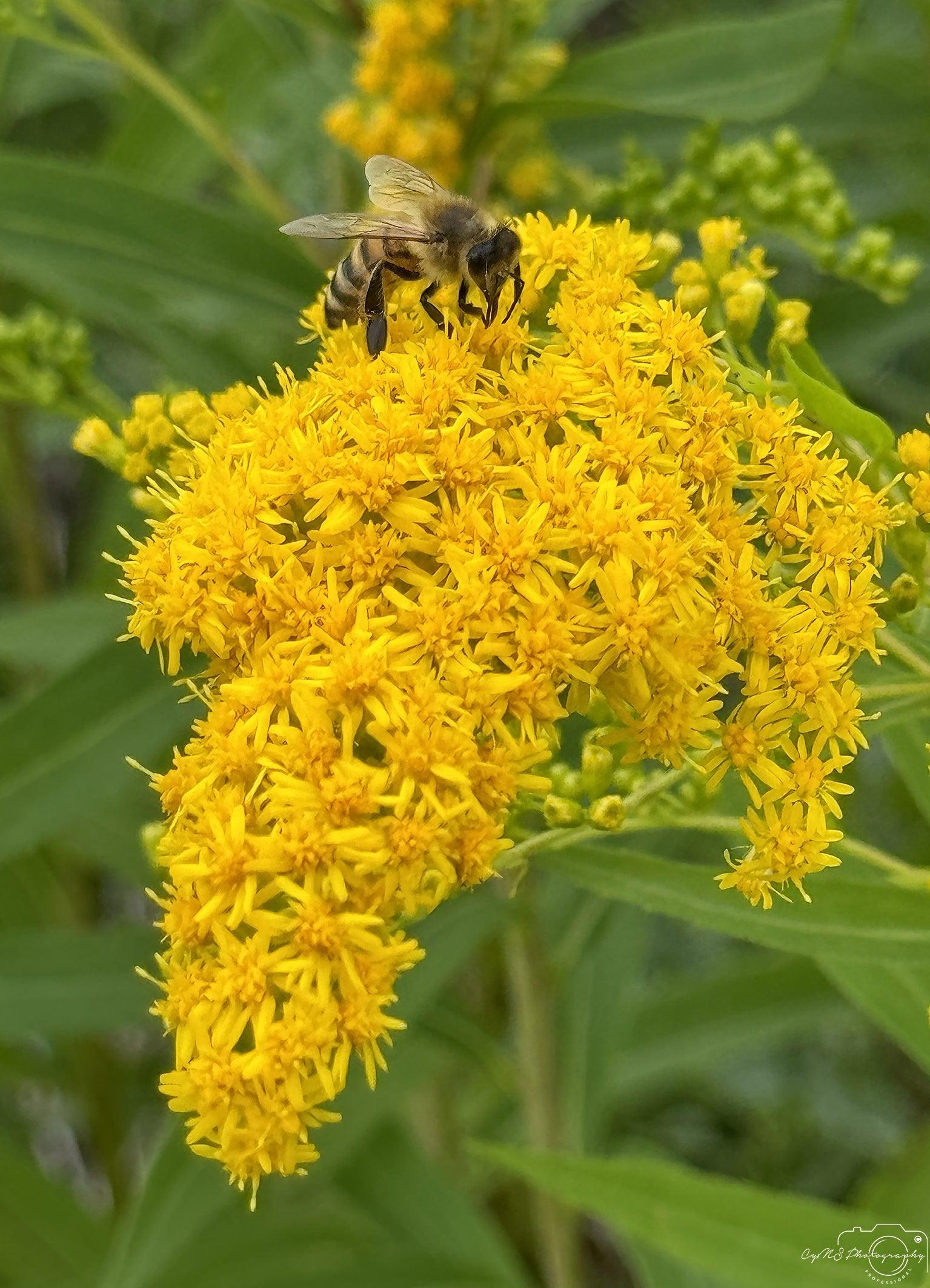 In this captivating shot, a bee is seen busily collecting nectar from a vibrant yellow Solidago gigantea flower. The rich golden petals of the flower form a striking contrast against the bee's fuzzy body, as it moves carefully from blossom to blossom. The warm tones of the flower seem to radiate in the sunlight, while the bee’s focused movements capture the essence of nature’s delicate yet crucial balance. The scene is a beautiful reminder of the harmony between pollinators and the plants they sustain, making this moment feel both peaceful and vital.