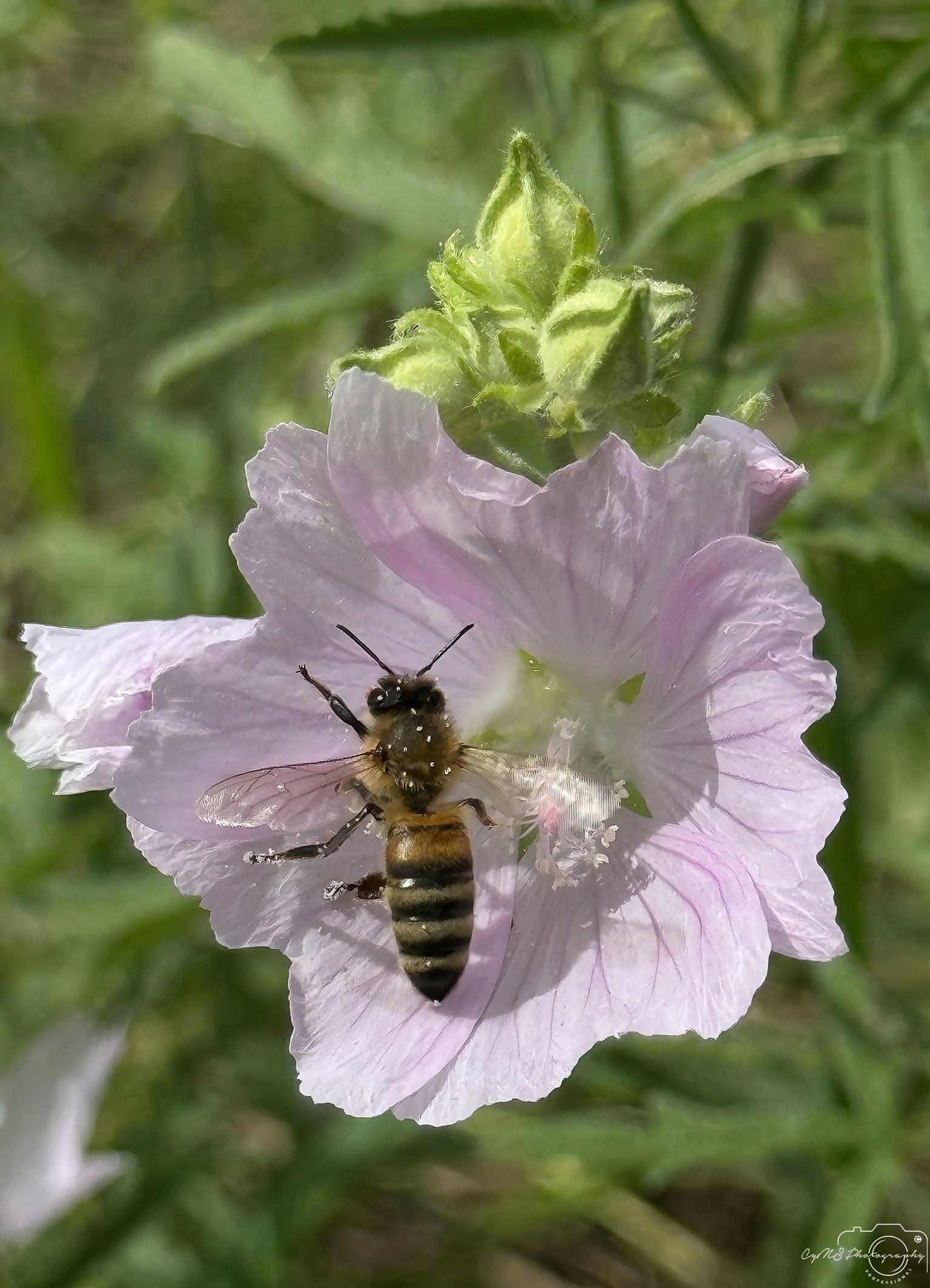 A bee is at the center of a Malva alcea, its delicate body surrounded by the soft, vibrant petals. One of its wings is in motion, creating a subtle blur as it flits from flower to flower, collecting nectar. The beautiful pink petals of the Malva alcea contrast beautifully with the bee’s yellow and black markings. There’s a sense of gentle movement, as the bee works diligently, its wing fluttering in the air, caught in the rhythm of nature’s dance. This moment captures the delicate balance of life and the mesmerizing beauty of the flower and the bee.
