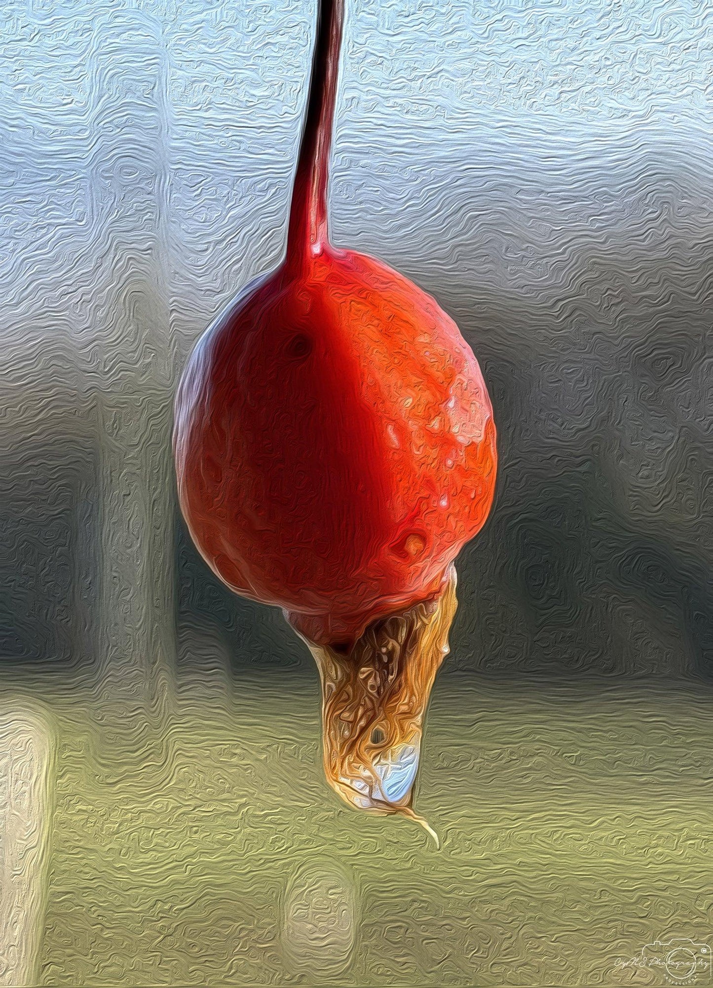 At the tip of a fruit of a Rosa canina, a water drop lies delicately, reflecting the surrounding branches and grasses in its smooth surface. Inside the droplet, a brown filament is visible, gently suspended within the clear water. Along with this, the bright blue sky is perfectly mirrored, its vibrant color stretching across the water’s surface. The droplet captures these two elements—earth and sky—in stunning harmony, with the filament adding a subtle, earthy texture against the vastness of the sky. Light dances across the water, enhancing the beauty of the reflection, where both the natural surroundings and the expansive sky are magnified within the droplet’s tiny sphere. It’s a serene moment, where nature’s delicate details come together in the fragile form of a single drop.
