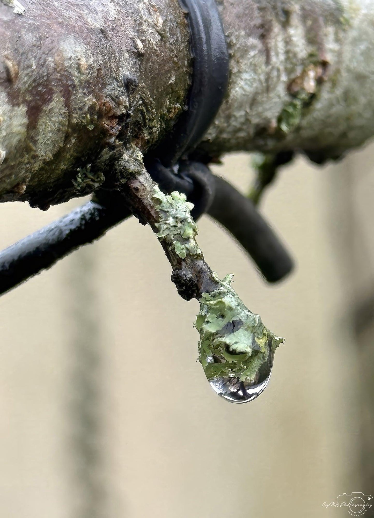 At the tip of a small branch, adorned with a delicate layer of moist grass, a glistening water droplet rests. It sparkles in the soft light, its smooth surface reflecting the world in a tiny, enchanting panorama. Suspended in perfect stillness, the droplet clings to the grass, a fleeting jewel of nature’s quiet beauty.