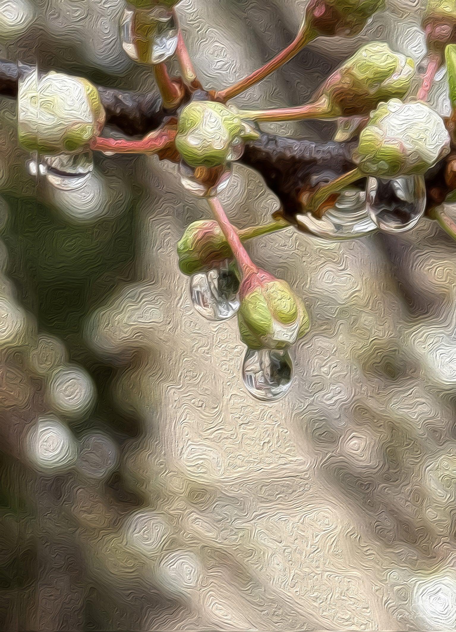 Countless droplets cling to the Myrobolan (Prunus), shimmering like tiny stars beneath its branches. The tree’s deep-hued blossoms and leaves frame the crystal beads, each reflecting the world in miniature. They tremble with the breeze, holding fleeting whispers of sky and earth.