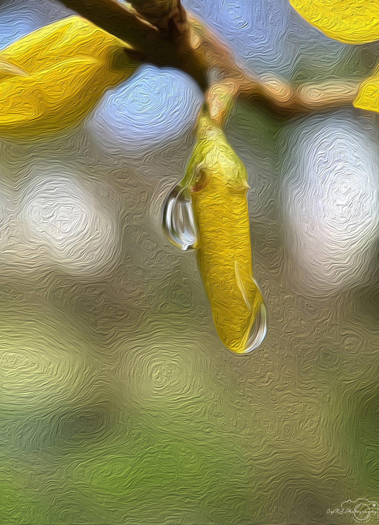 On the Forsythia intermedia, a single closed bloom, shaped like a tiny banana, cradles two glistening droplets. They cling to its smooth yellow surface, reflecting the world in miniature. In this quiet moment, nature’s beauty shines in delicate simplicity.