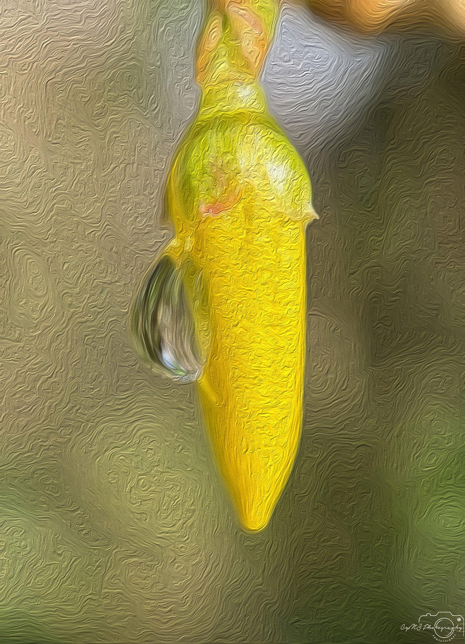 On the Forsythia intermedia, a closed bloom shaped like a tiny banana cradles a single droplet. The droplet clings to the smooth yellow petal, reflecting the vibrant hues in a perfect, up-close moment. The scene is intimate, showcasing nature’s delicate elegance.
