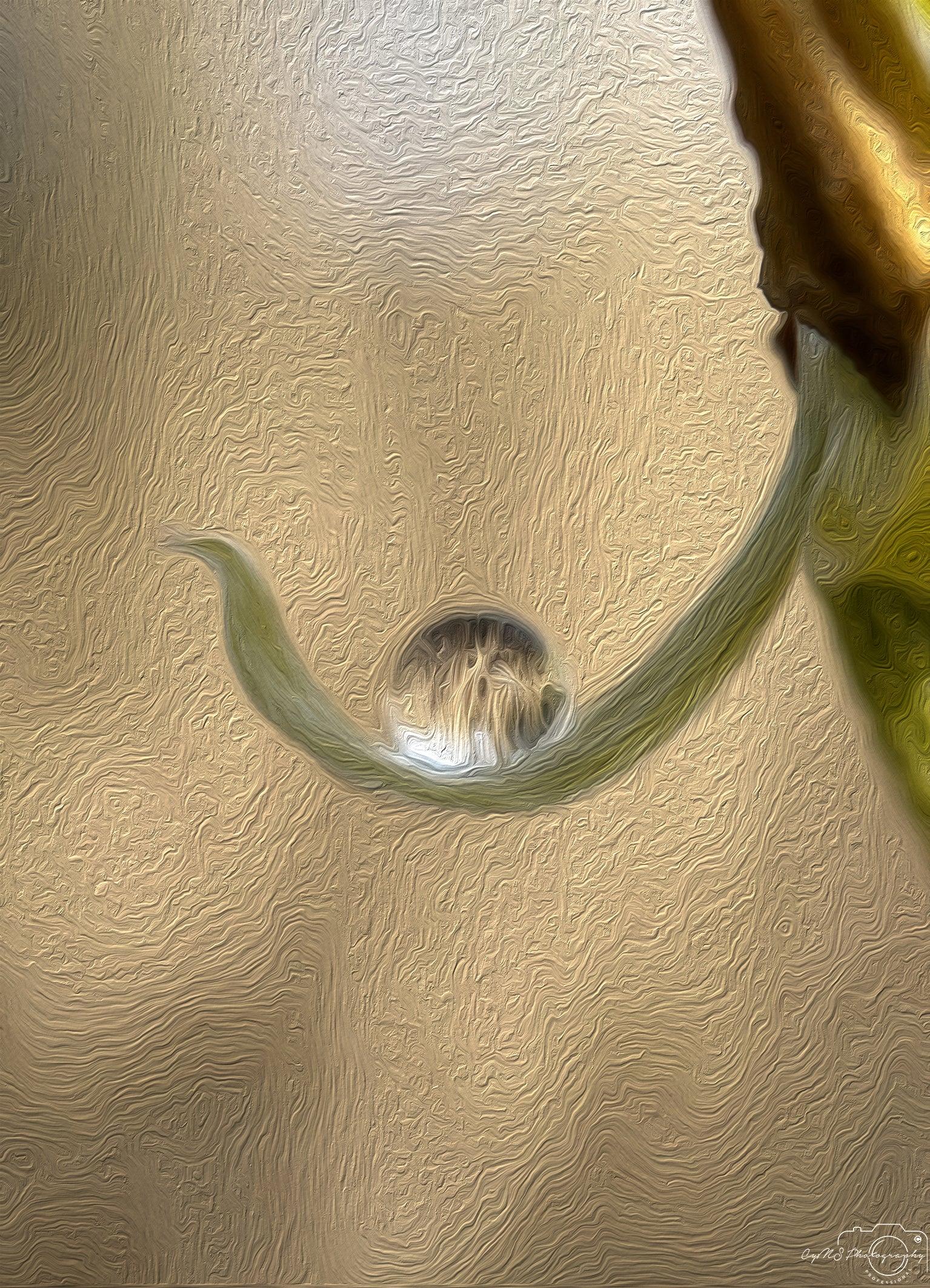 On a leaf of the Salix babylonica, curved like a gondola, a magnificent, perfectly rounded droplet rests, reflecting its serene surroundings with crystal clarity. The calmness of the scene enhances its beauty, as the droplet captures the gentle light and tranquility of nature in a moment of perfect stillness.