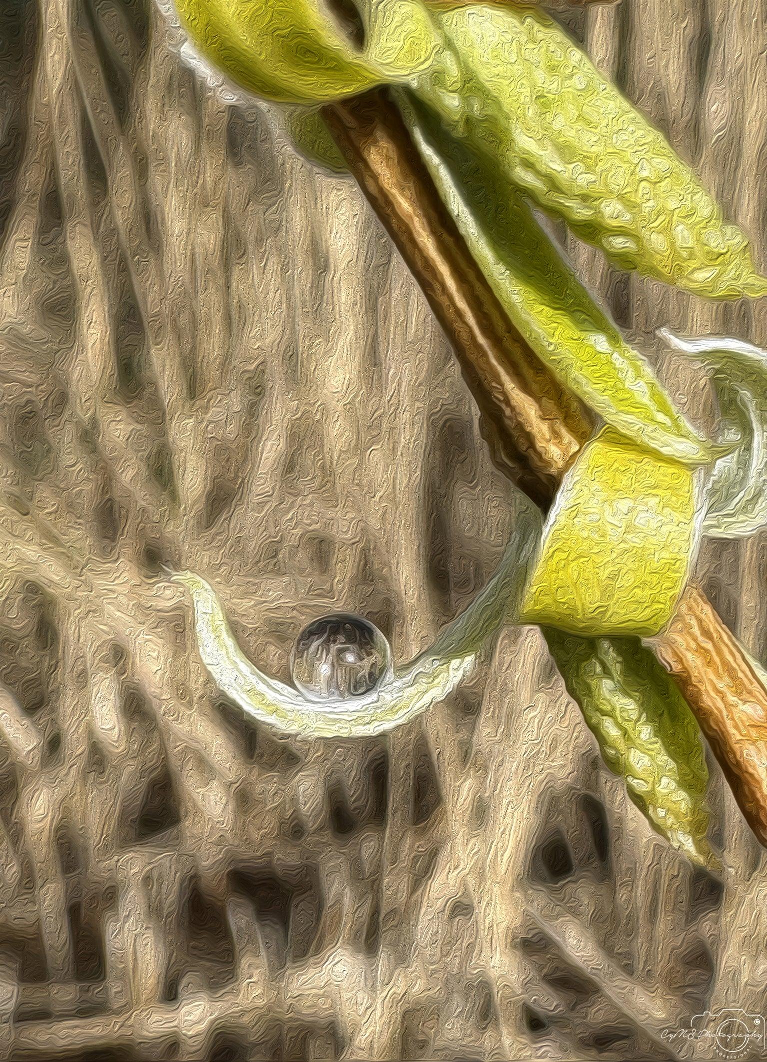 On a leaf of the Salix babylonica, curved like a gondola, a magnificent, perfectly rounded droplet rests, reflecting its serene surroundings with crystal clarity. The calmness of the scene enhances its beauty, as the droplet captures the gentle light and tranquility of nature in a moment of perfect stillness.