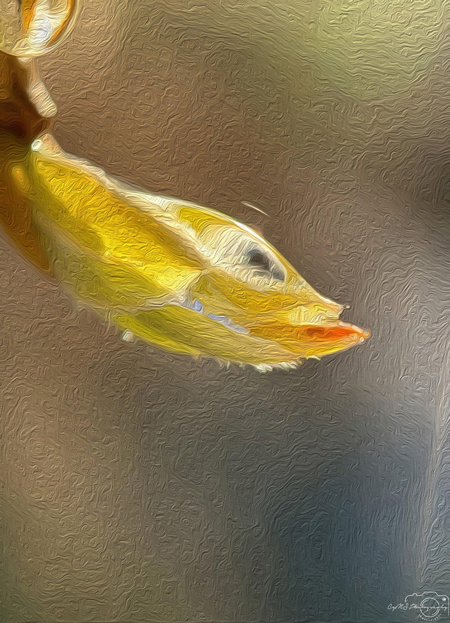 On a leaf of the Salix babylonica, a droplet has completely merged into the surface, taking the shape of a small fish. Its yellow body gleams, while a red streak at the tip resembles a tongue. The tranquil scene, bathed in soft light, feels like a quiet moment frozen in time.