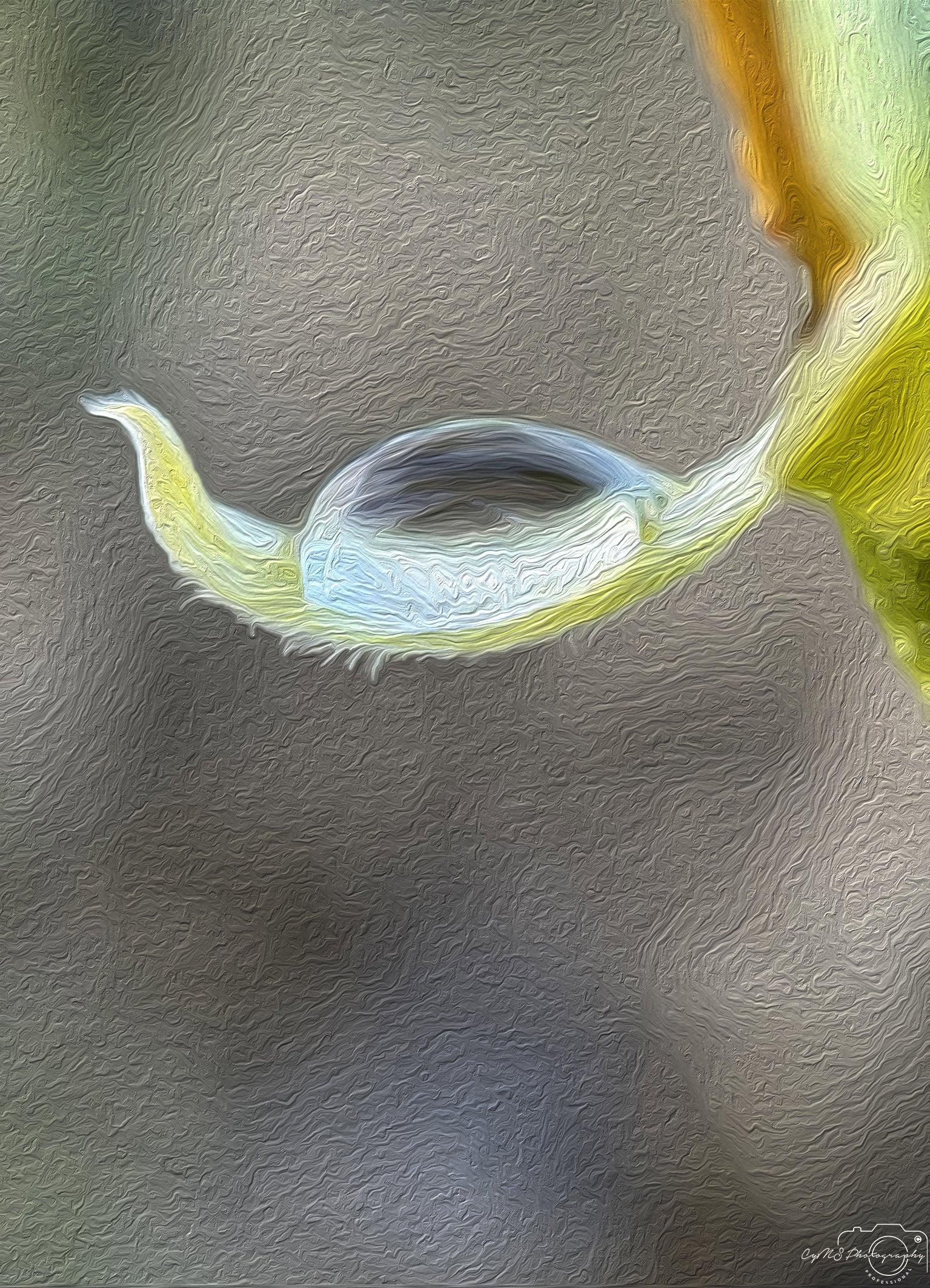On a leaf of the Salix babylonica, curved like a gondola, a magnificent, oval droplet rests, its beautiful bluish hue reflecting its serene surroundings with crystal clarity. The calmness of the scene enhances its beauty, as the droplet captures the gentle light and tranquility of nature in a moment of perfect stillness.